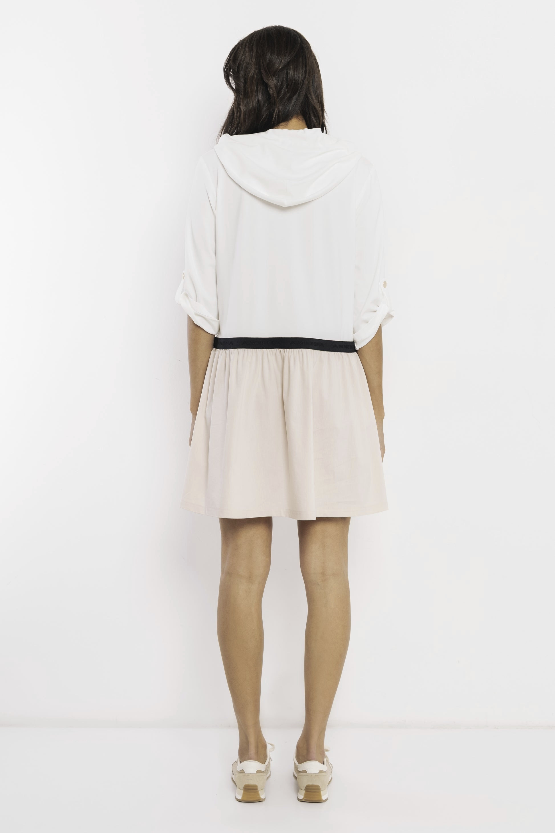 Amnesia bő szabású, sportos fazonú ruha bézs és ekrü színben; húzózsinóros kapucnival; elejében rejtettzipzáros záródásssal; felpatentolható ujjakkal; derekán márkajelzett gumírozással.