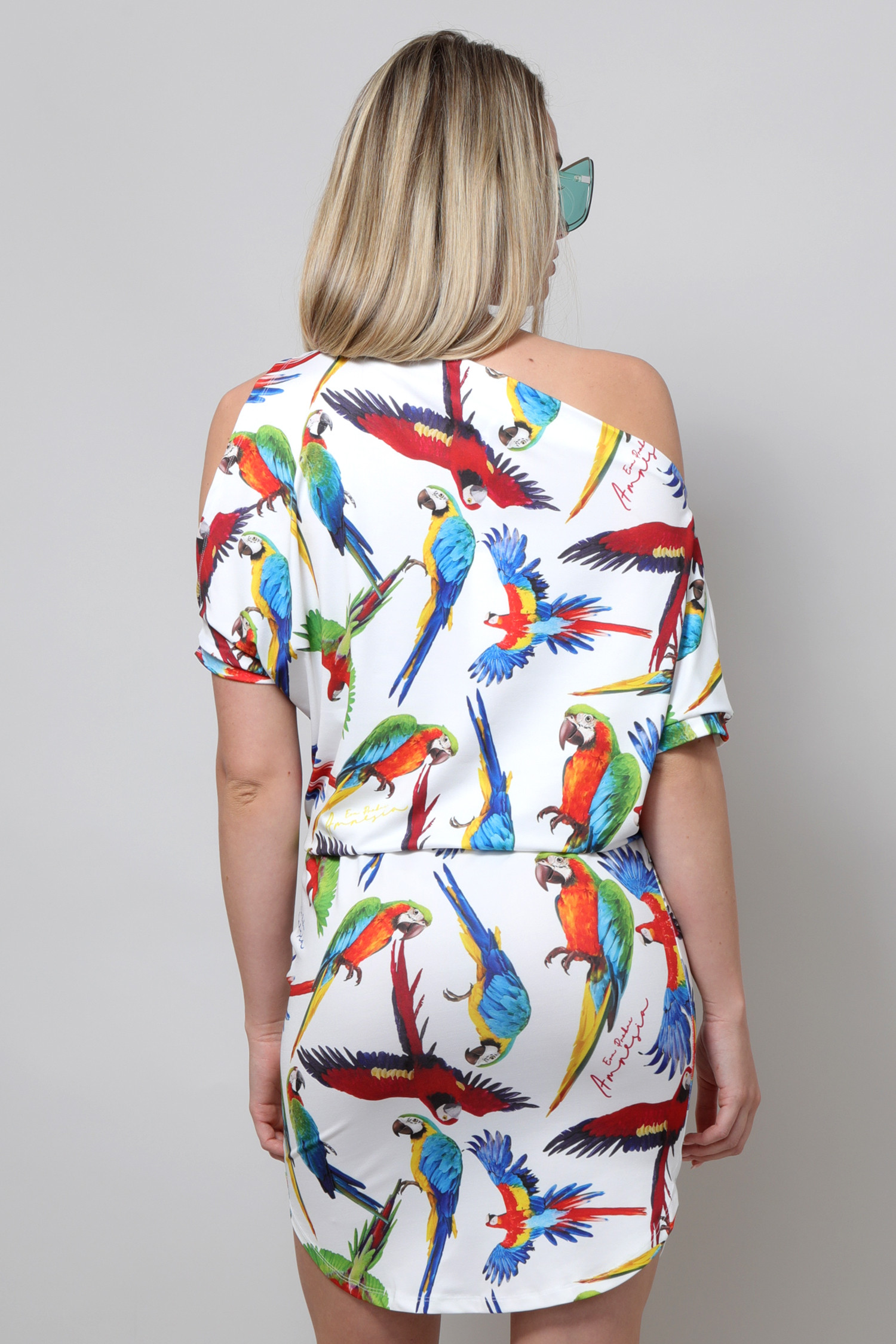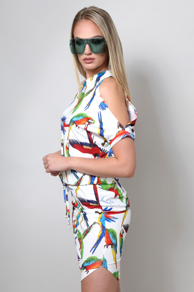 Amnesia Fashion - Eva Prokai - (Euridike) ruha, fehér alapon színes papagáj mintával, derekán megkötős, aszimmetrikus felső résszel, anyagában márkajelzéssel a nyári Amnesia kollekcióból.