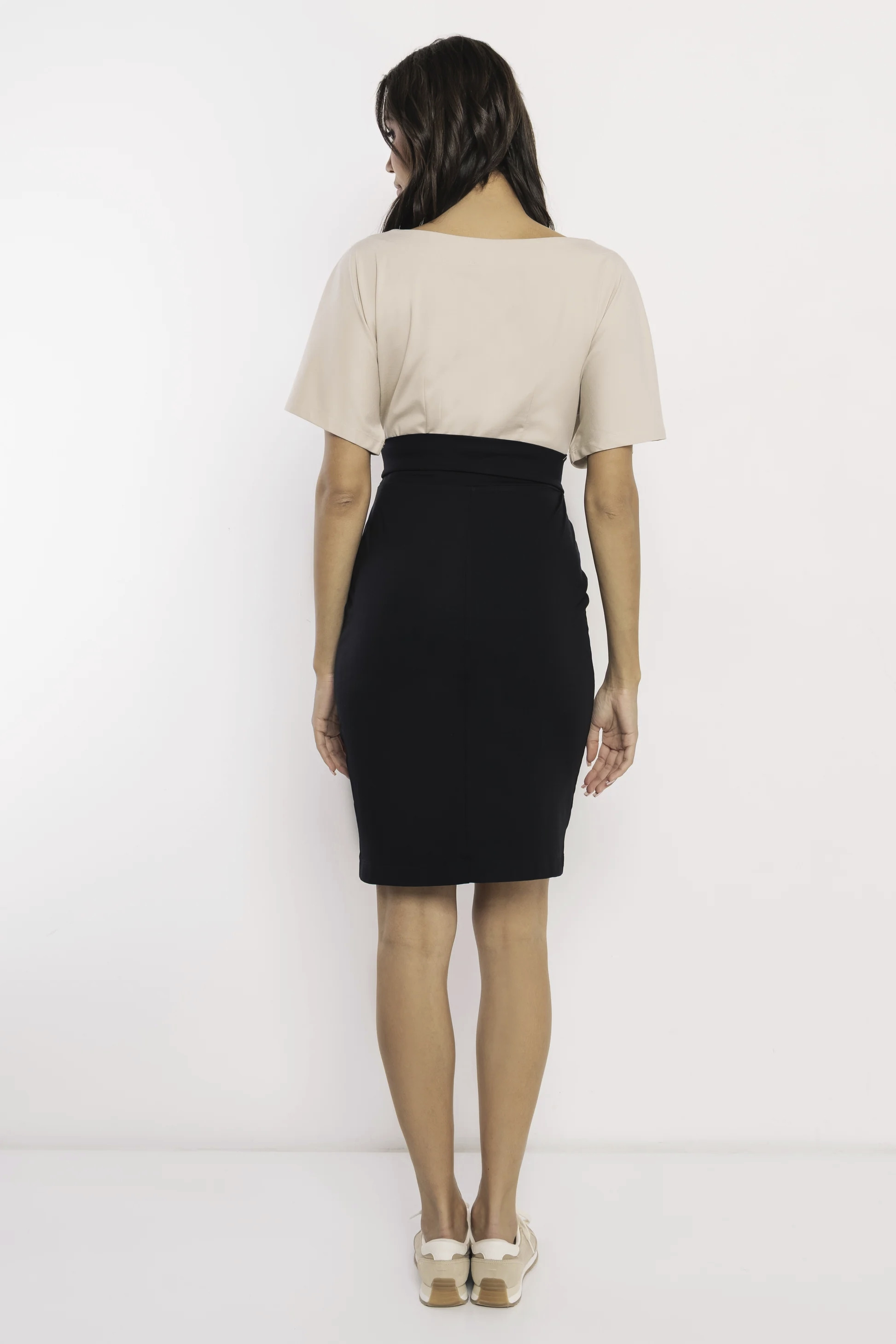 Amnesia punto ruha homok és fekete színben; bővebb szabású felrőrésszel; mell alatt hajtásokkal; testhezálló szoknyarésszel; hozzátartozó anyagazonos megkötővel; mell részén hangsúlyos márkajelzéssel.