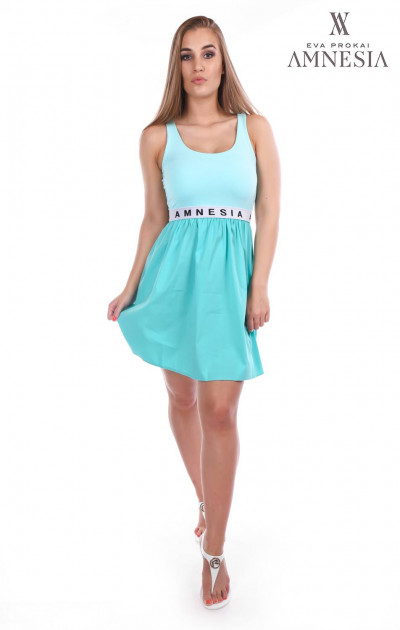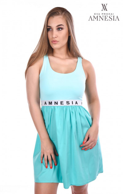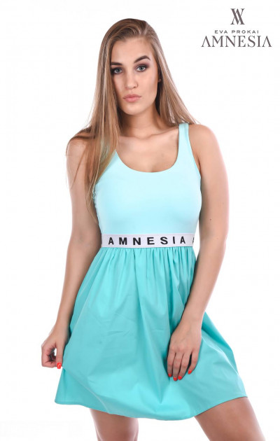 Amnesia Fashion - Eva Prokai ruha (Jubilo) türkiz színben, derekán gumírozott filmnyomott márkajelzéssel a nyári Amnesia kollekcióból.