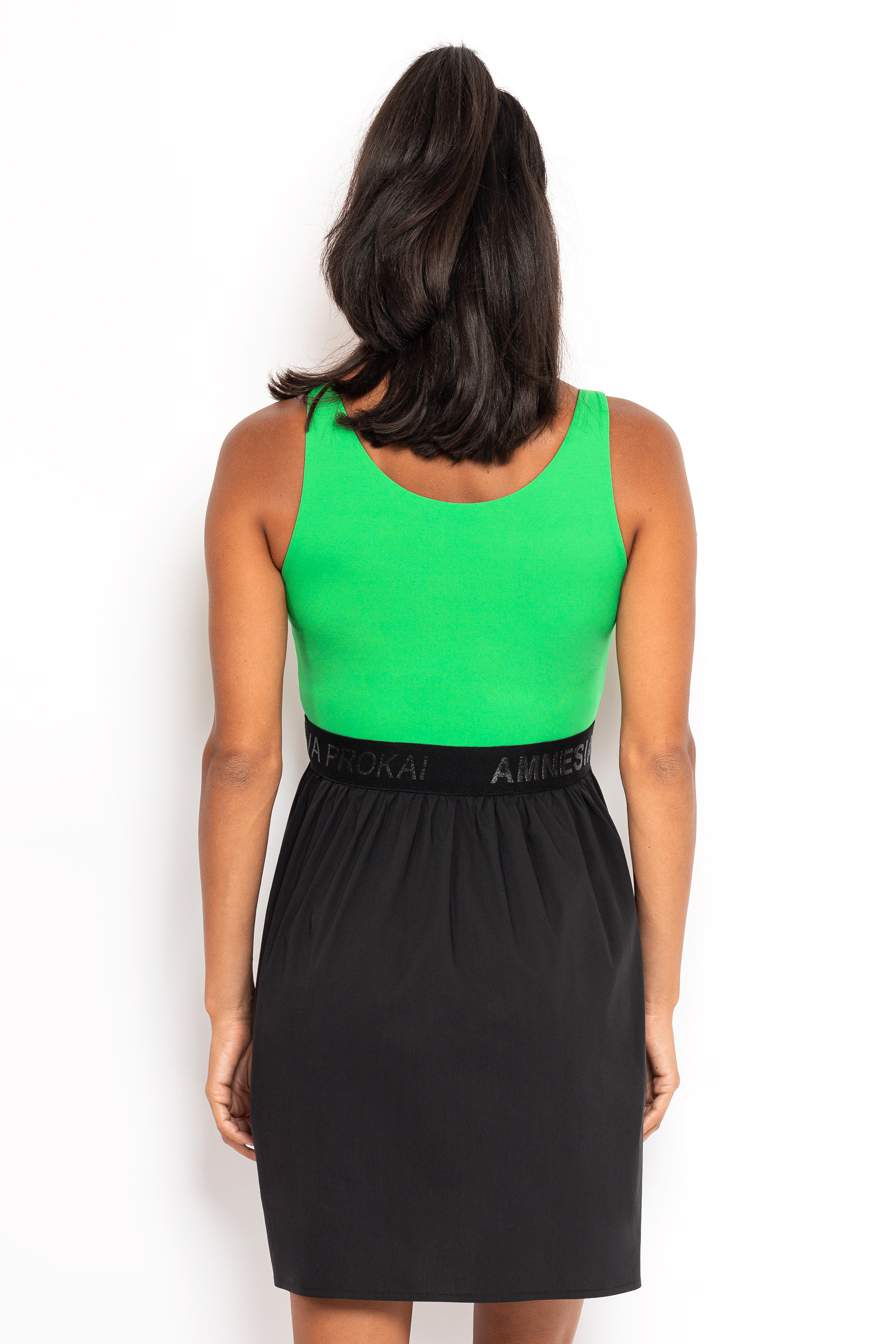 Amnesia Fashion - Eva Prokai ujjatlan ruha teshezálló zöld színű felsőrésszel, kerek nyakkivgással, bővebb szabású, fekete színű szoknyarésszel, derekán márkajelzett gumírozással a nyári Amnesia kollekcióból.