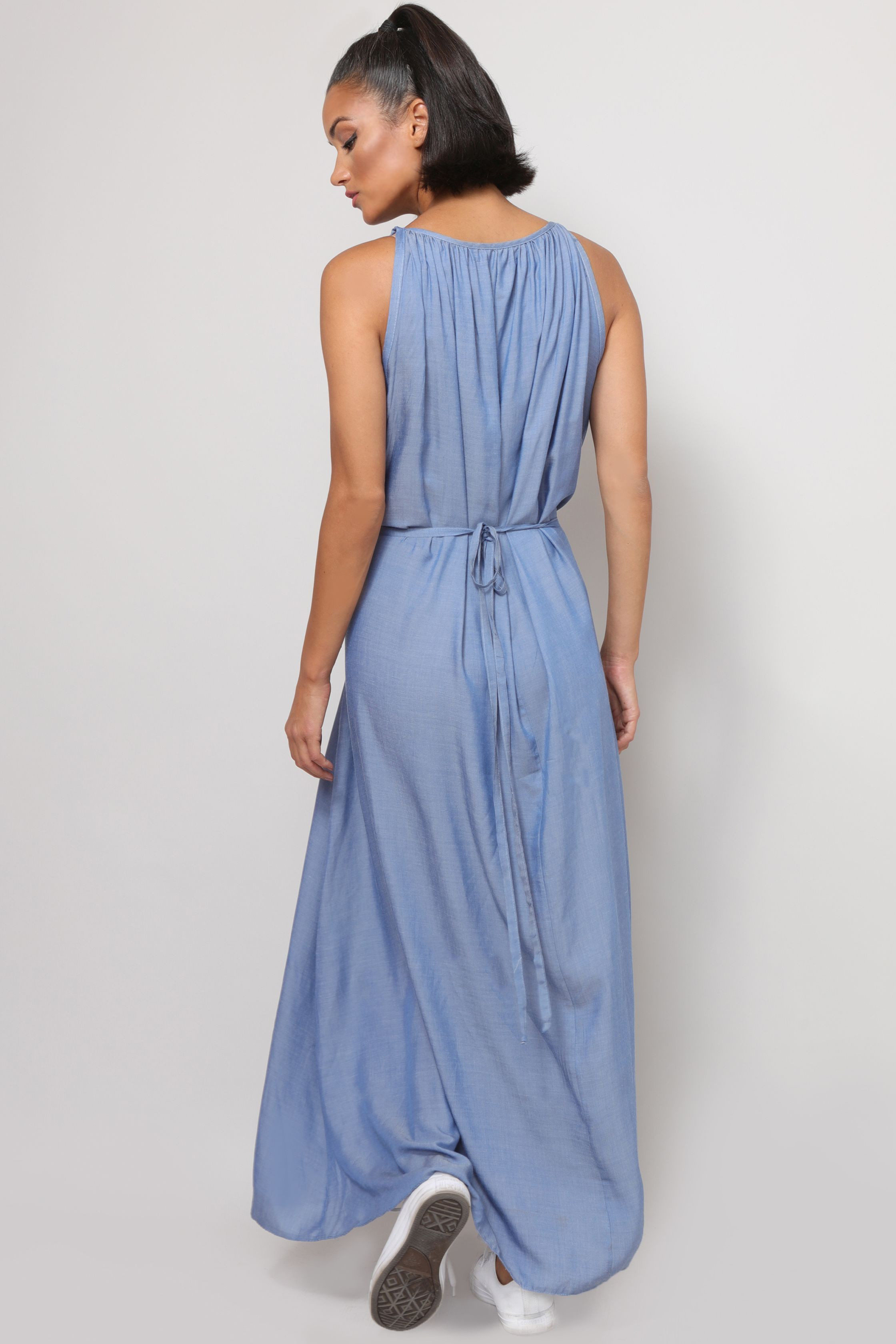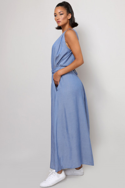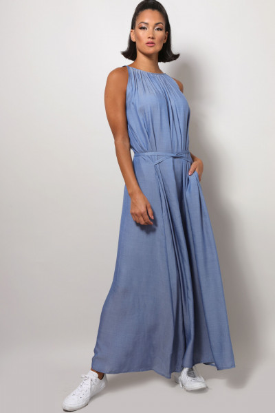 Amnesia Fashion - Eva Prokai - (Keve) maxi ruha, kék színben, farmer hatású, derekán megkötős, oldalzsebes, nyak részén fém márkajelzéssel a nyári Amnesia kollekcióból.