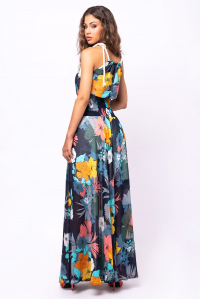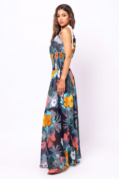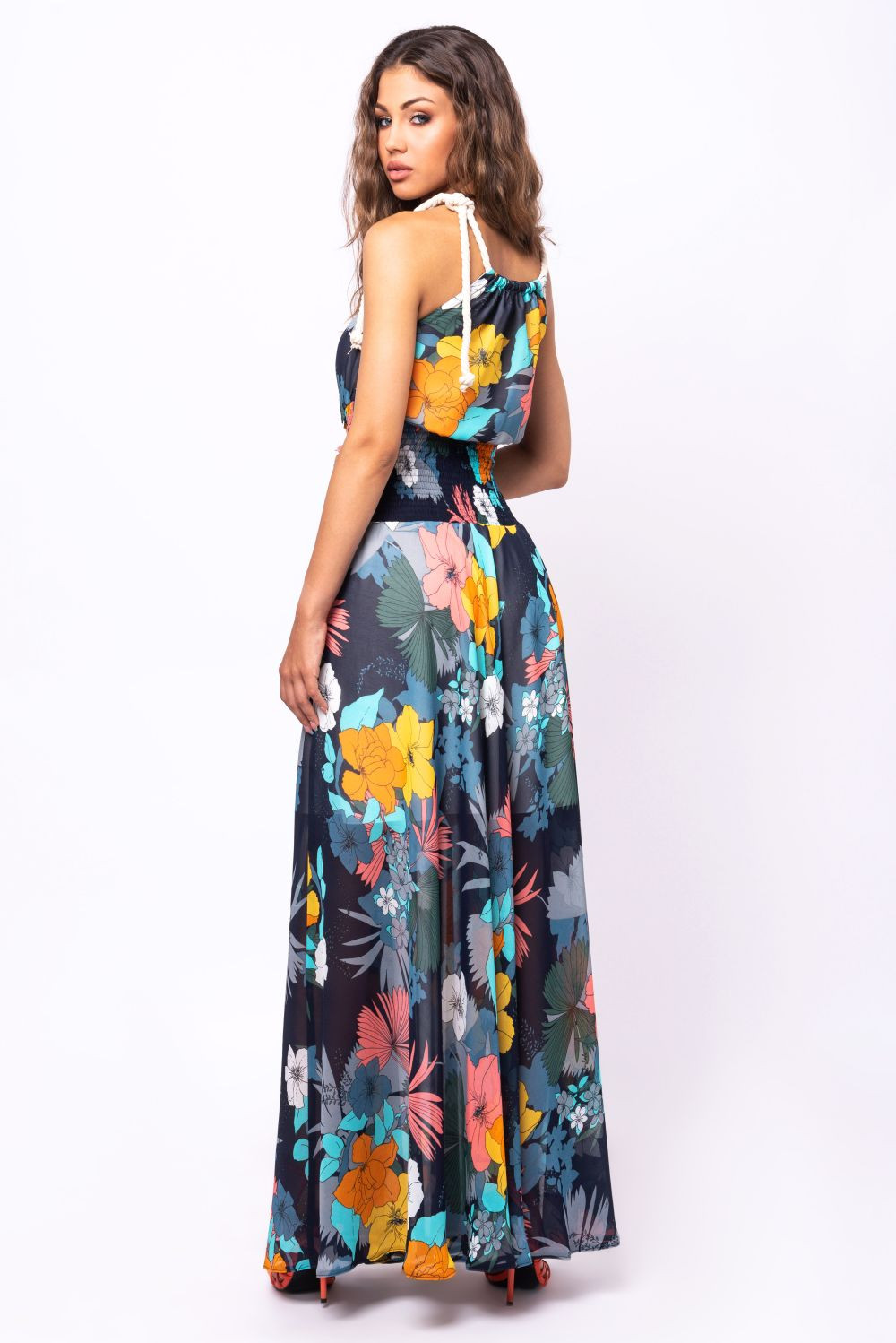 Amnesia Fashion - Eva Prokai maxi ruha, színes virágos mintával, derekán gumírozással, kötélszerű pántokkal, elején apró fém márkajelzéssel a nyári Amnesia kollekcióból.