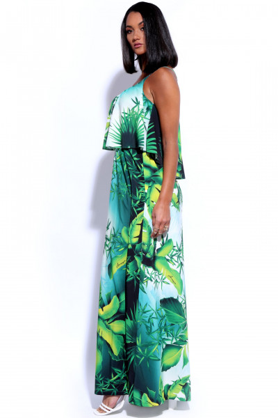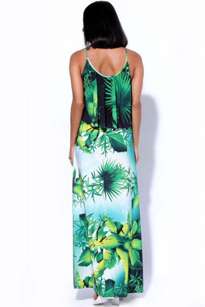 Amnesia Fashion - Eva Prokai maxiruha (Nikky), zöld színben, trópusi mintával, spagettipánttal; gumírozott derékrésszel; anyagábal márkajelzéssel a nyári Amnesia kollekcióból.