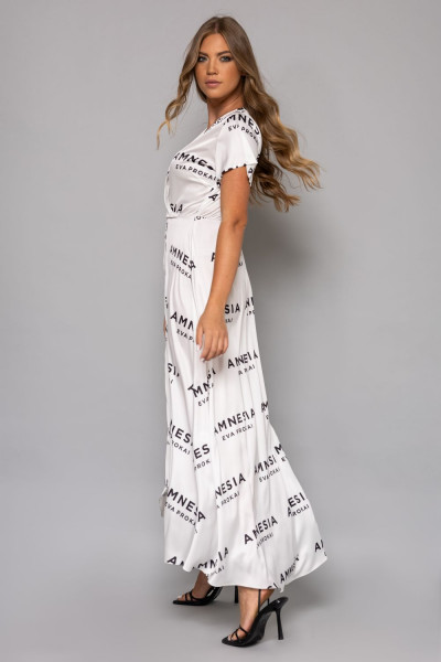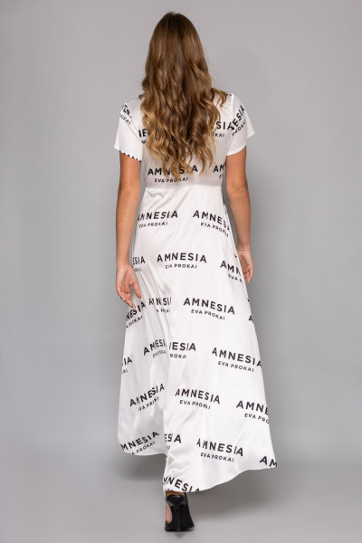 Amnesia Fashion - Eva Prokai ruha, ekrü színben, elején átlapolással, derekán gumírozással, anyagában fekete színű márkafelirattal.
