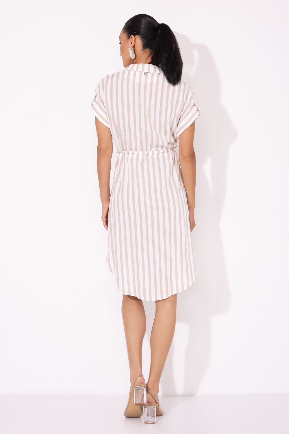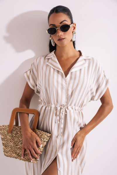 Amnesia laza szabású lenge női ruha, bézs/fehér csíkos. Elején gombos, dereka összehúzható, háta nyaki részén fém márkajlezéssel.