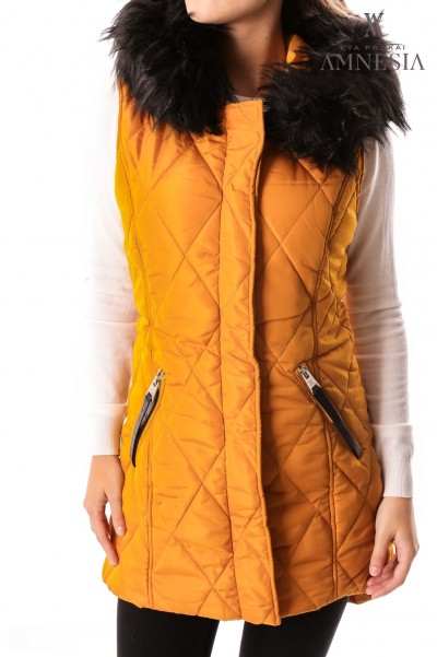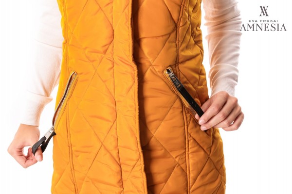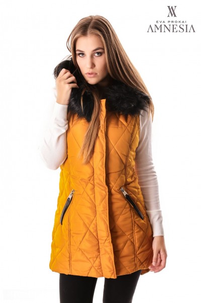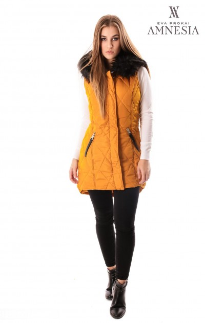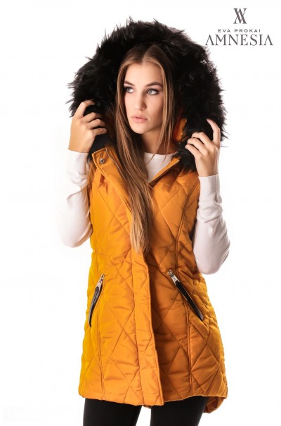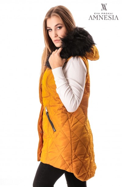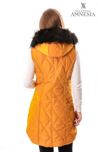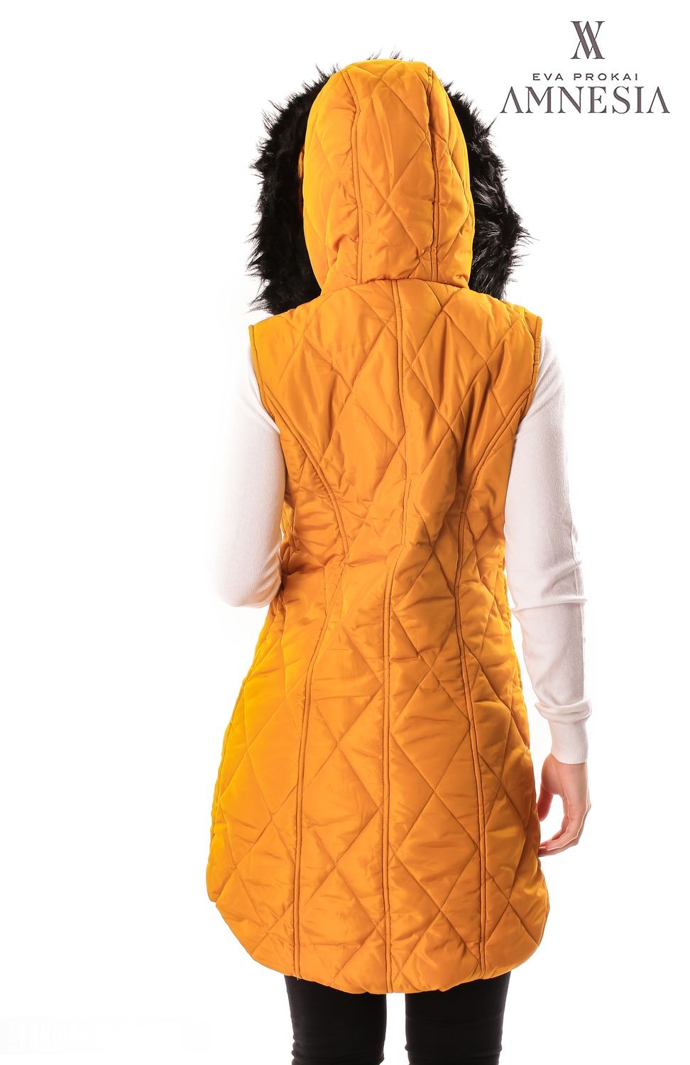 Amnesia Fashion - Eva Prokai szőrmés kapucnis steppelt mellény, mustár sárga színben, elején patenttal és zipzárral, hátul hosszított fazonban, kapucniján a szőrme levehető, oldalzsebes fazonban, zipzárján márkajelzéssel az őszi Amnesia kollekcióból.