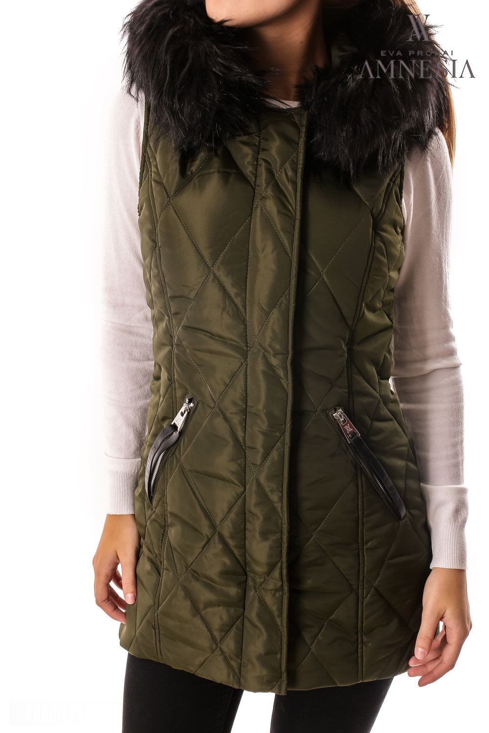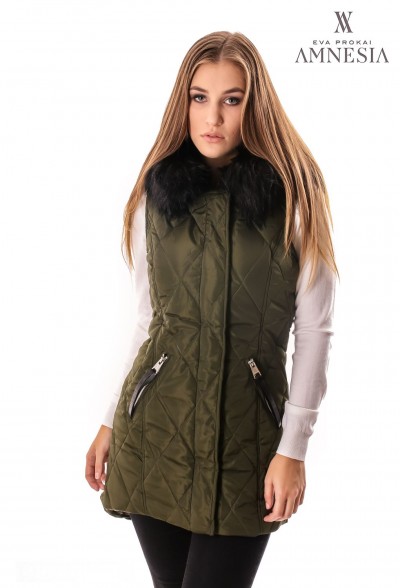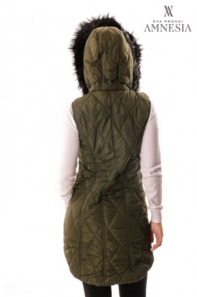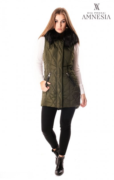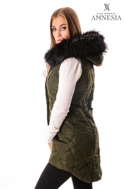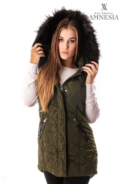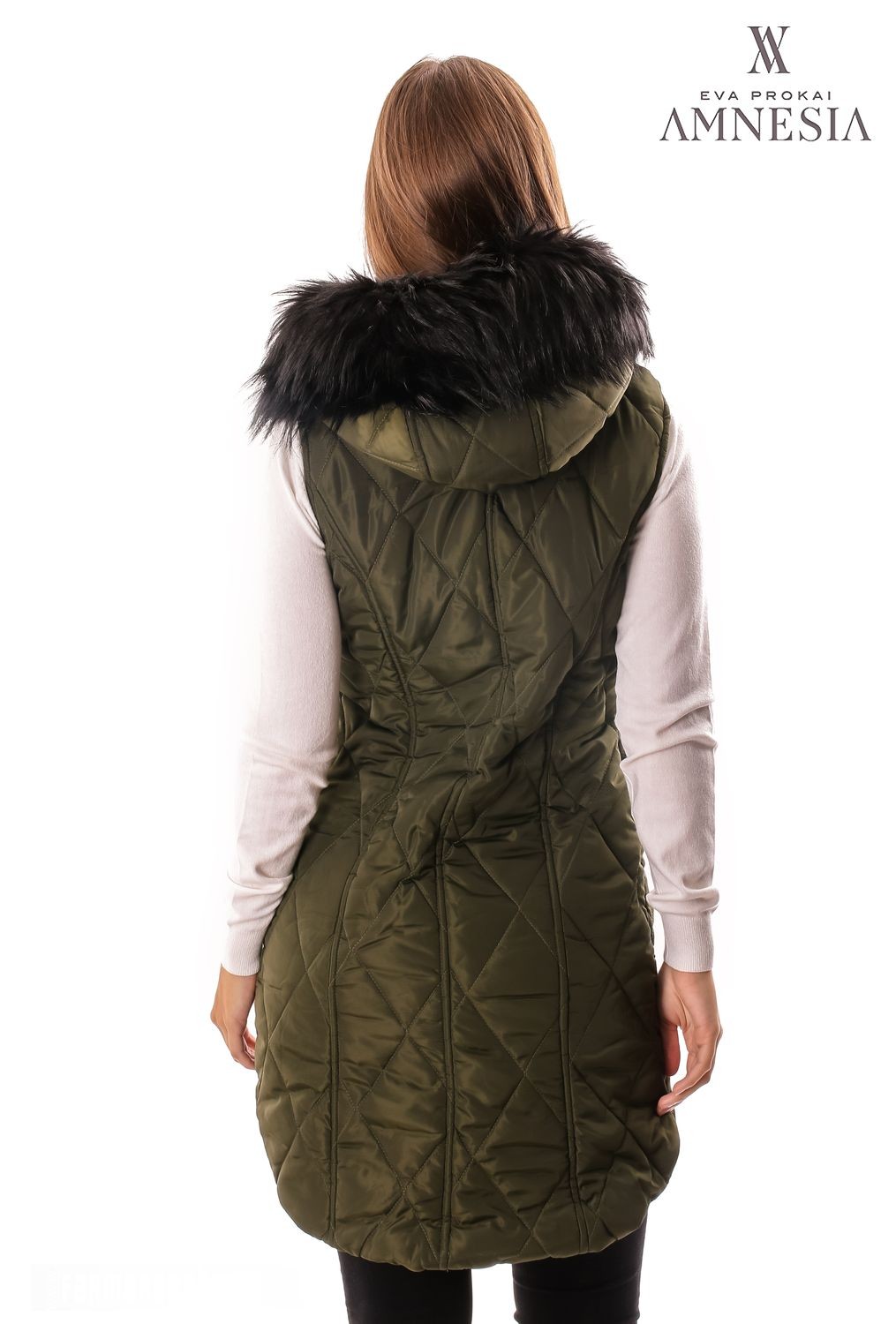 Amnesia Fashion - Eva Prokai szőrmés kapucnis steppelt mellény, khaky színben, elején patenttal és zipzárral, hátul hosszított fazonban, kapucniján a szőrme levehető, oldalzsebes fazonban, zipzárján márkajelzéssel az őszi Amnesia kollekcióból.