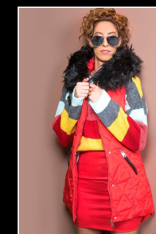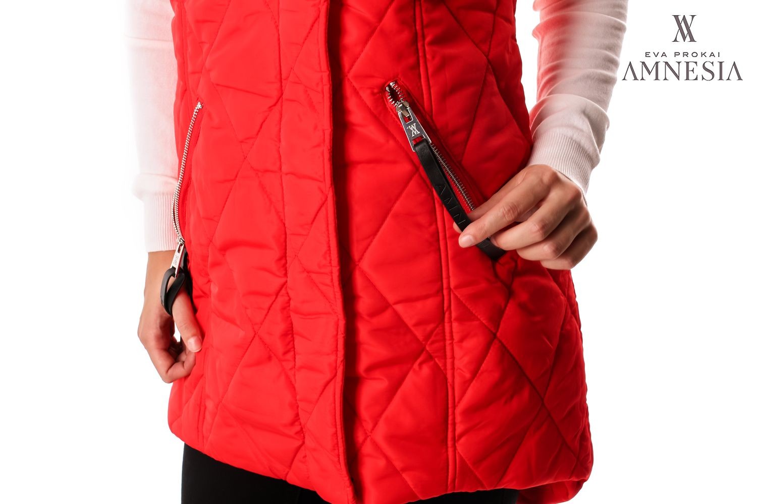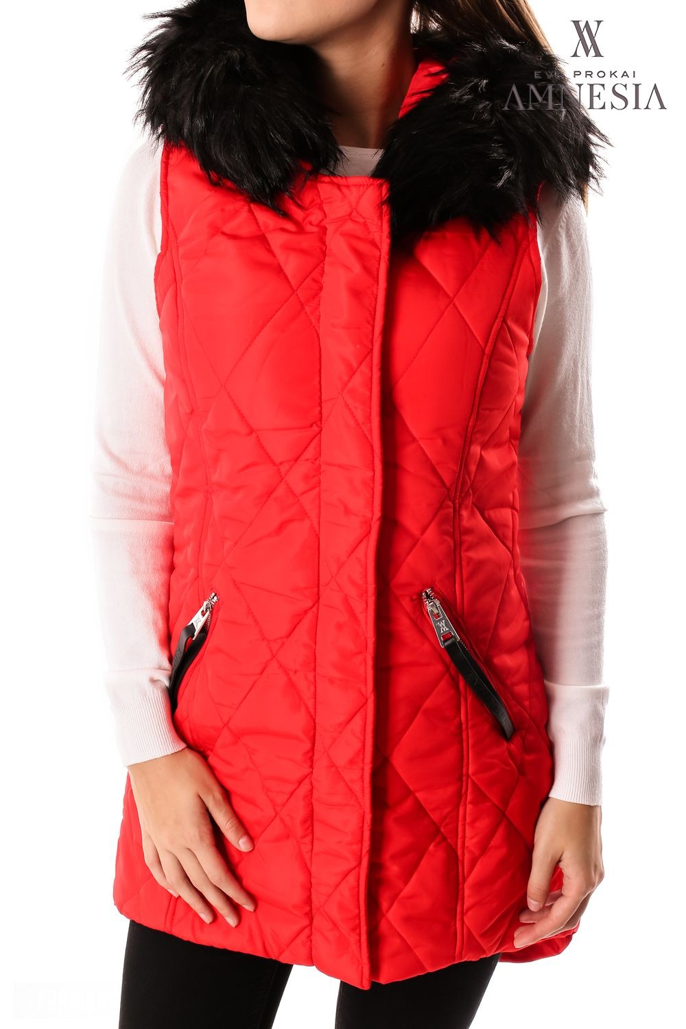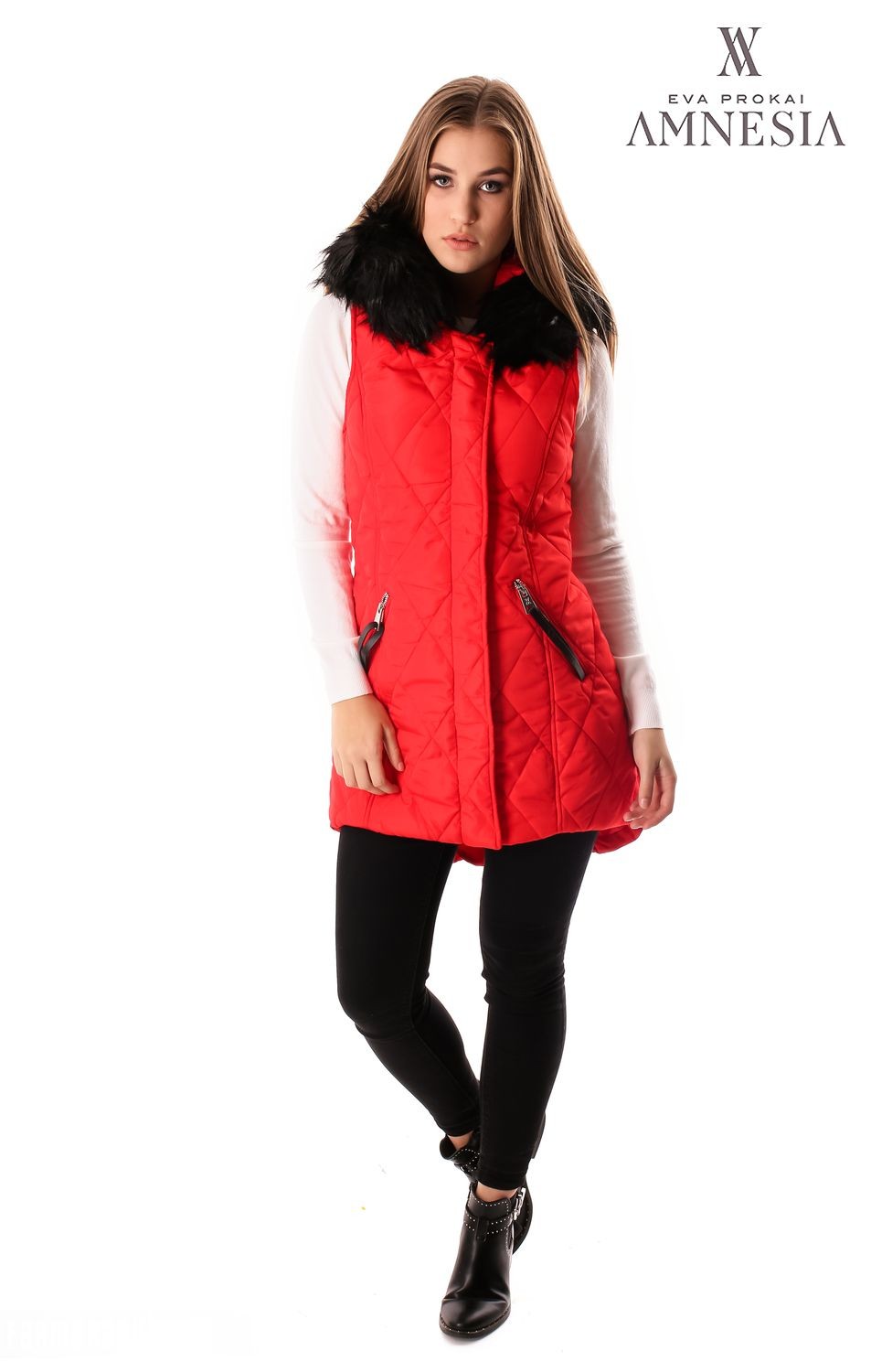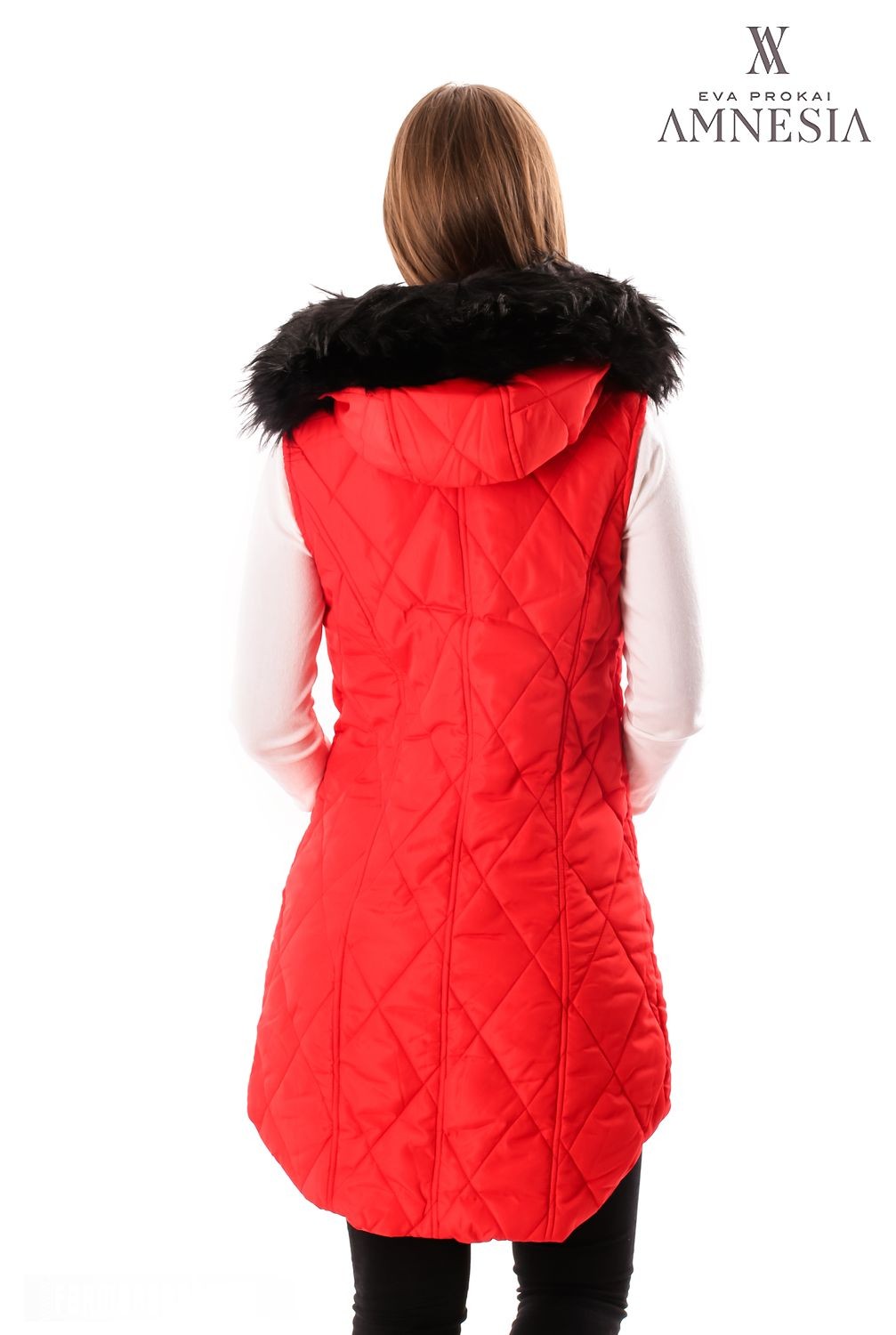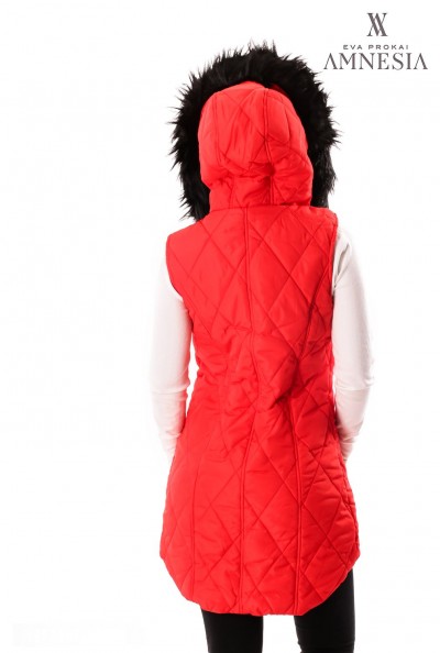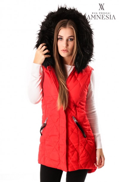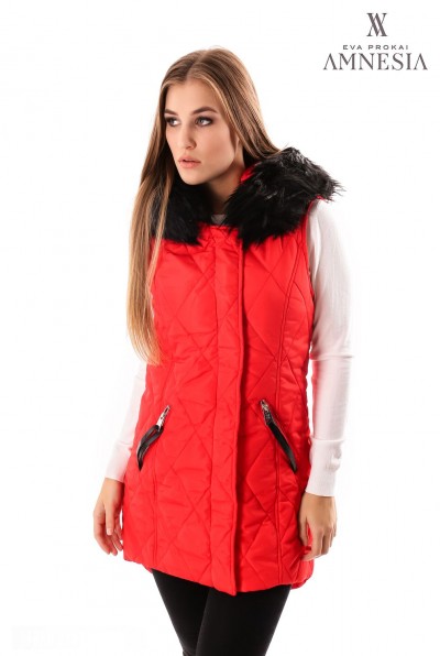 Amnesia Fashion - Eva Prokai szőrmés kapucnis steppelt mellény, piros színben, elején patenttal és zipzárral, hátul hosszított fazonban, kapucniján a szőrme levehető, oldalzsebes fazonban, zipzárján márkajelzéssel az őszi Amnesia kollekcióból.