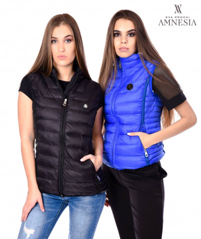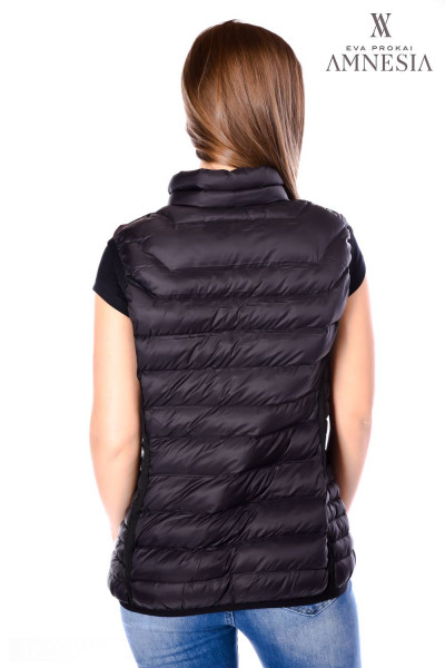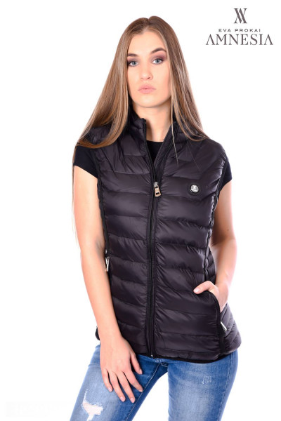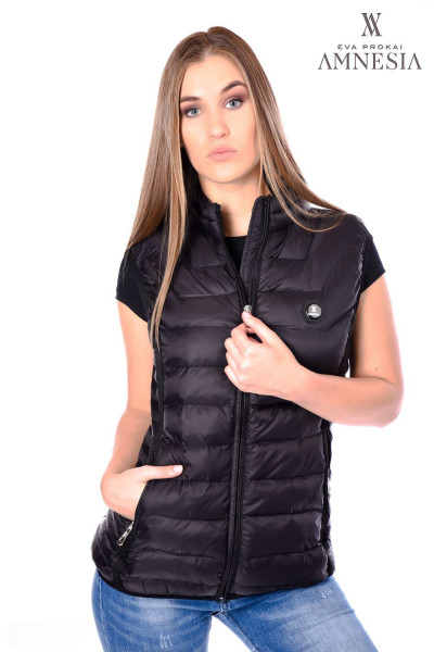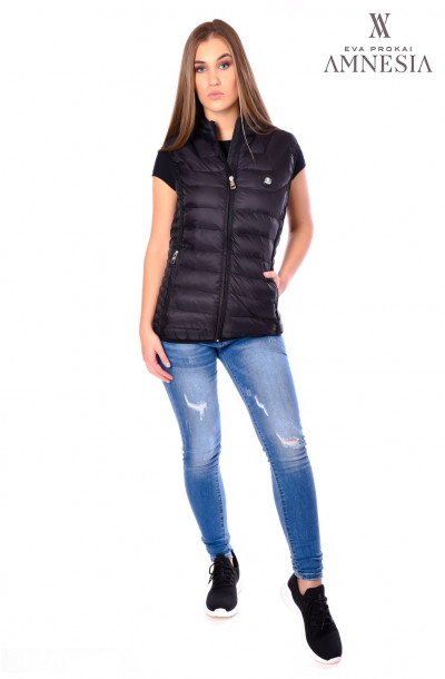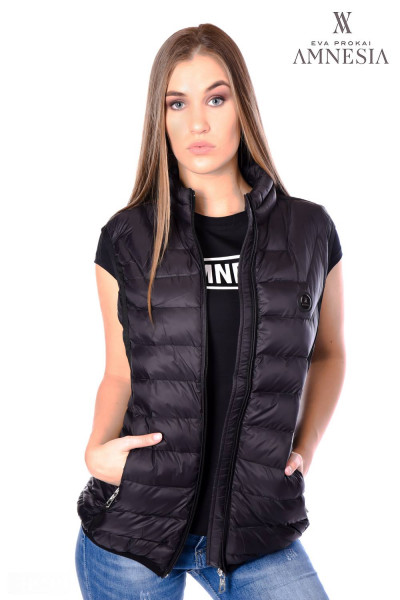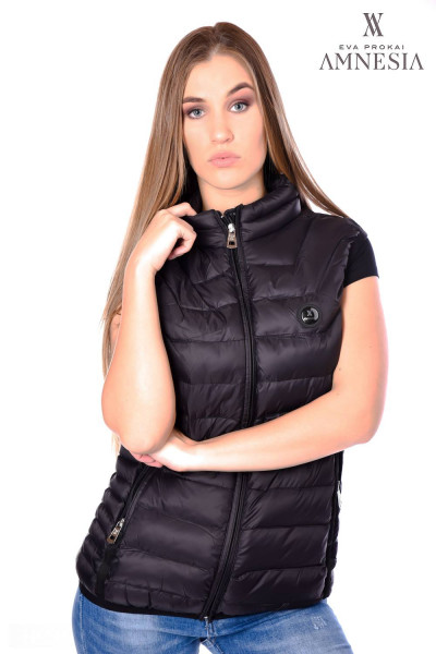 Amnesia Fashion - Eva Prokai steppelt mellény, fekete színben, cipzáras oldalzsebekkel, mellrészén márkajelzéssel a tavaszi Amnesia kollekcióból.