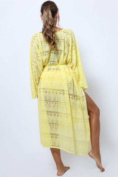 Amnesia Fashion - Eva Prokai horgolt hatású strandruha (Doxi), sárga színben, dereka megkötős, hátán fém márkajelzéssel a nyári Amnesia kollekcióból.