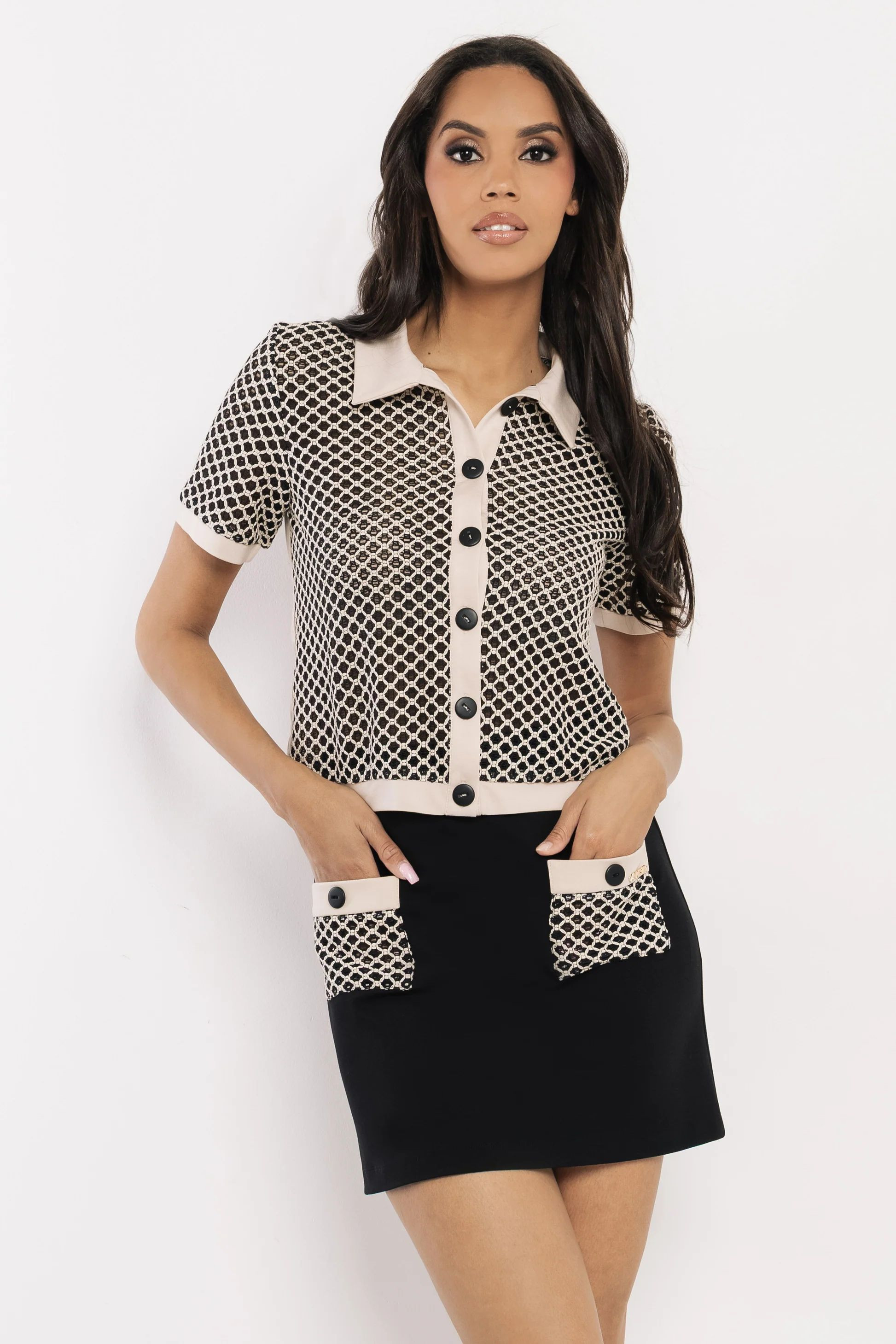 Amnesia mini szoknya , fekete színben. Derekán hátul cipzárral, elején két kis horgolt folt zsebbel és fém márkajelzéssel.