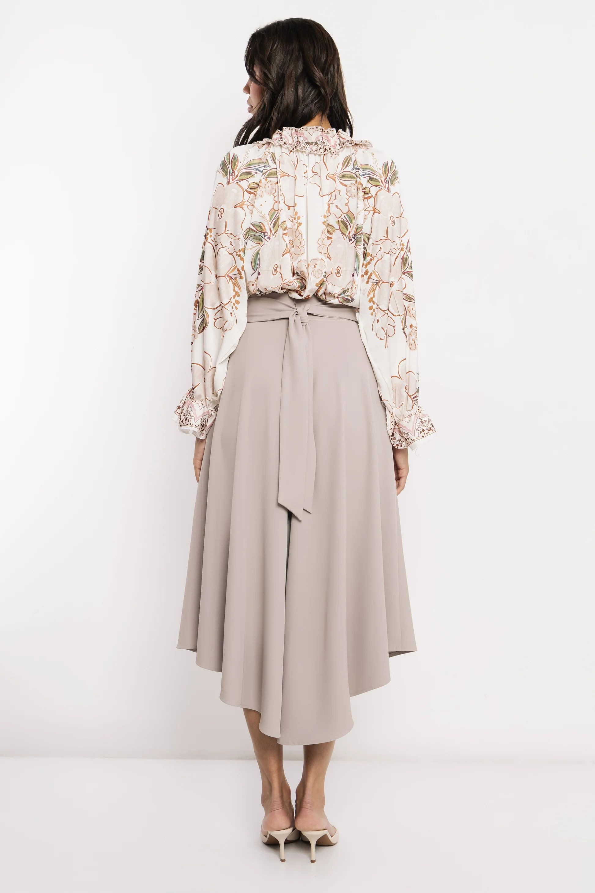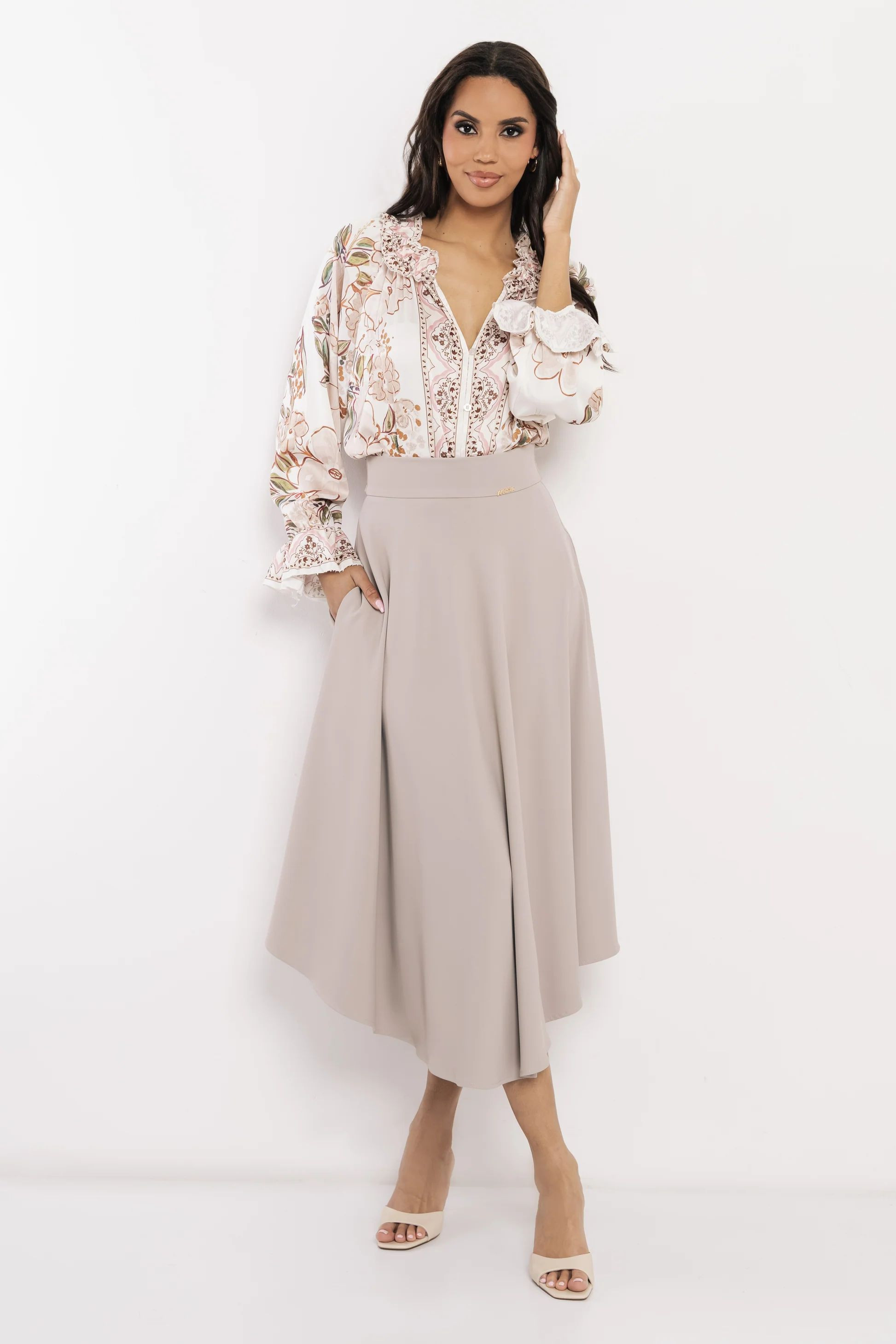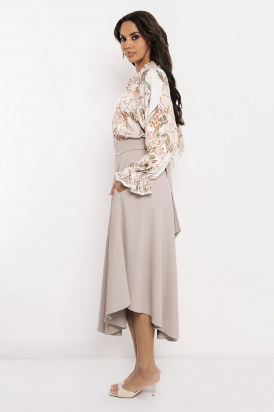 Amnesia lágy esésű szoknya, fangó színben. Két oldalán rövidebb, oldalzsebes, hátulján rejtett cipzárral, magas derekán megkötővel és fém márkajelzéssel.