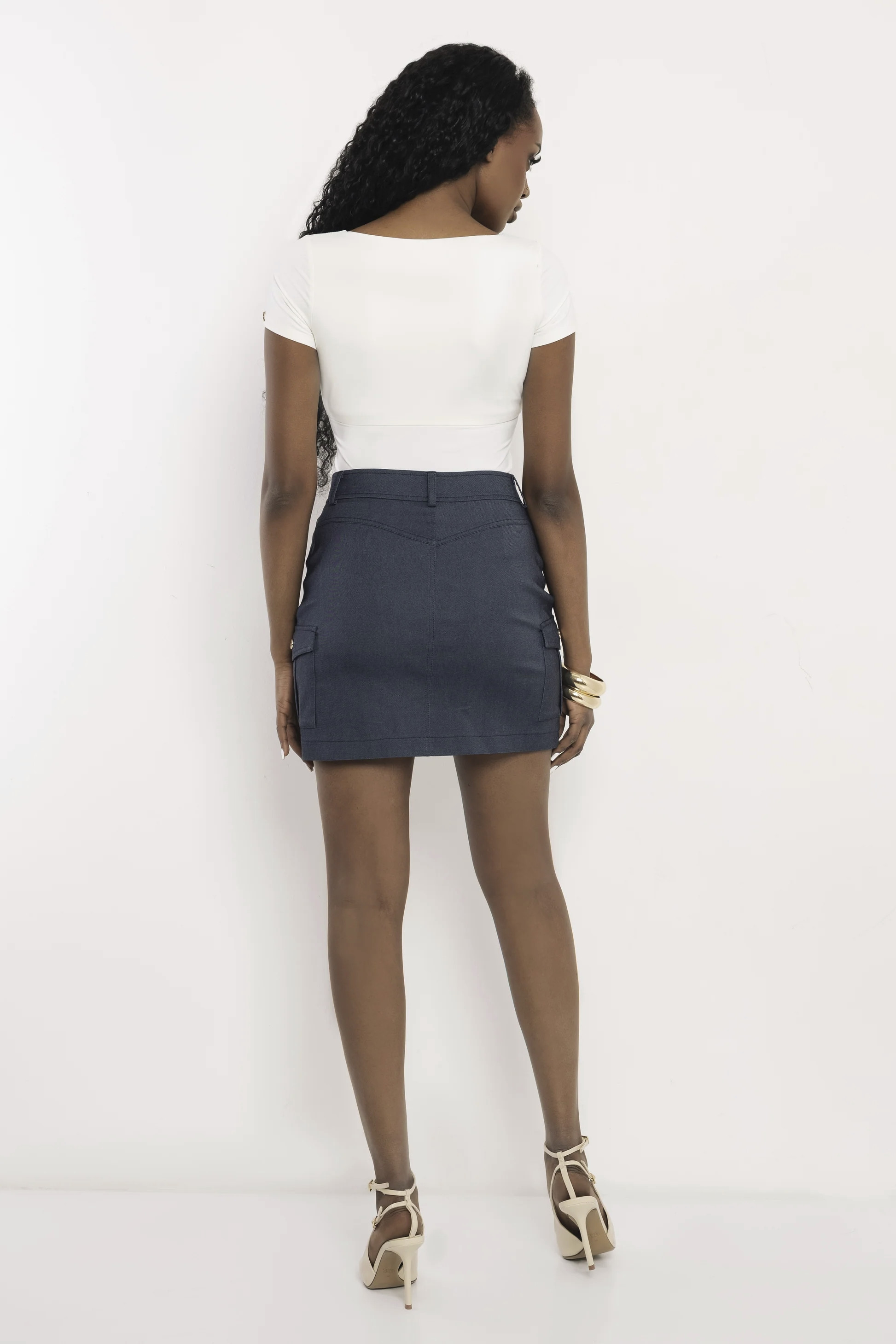 Amnesia cargo fazonú miniszoknya sötét szürkéskék színben; denim hatással; övbújtatós derékkal; patentos és zipzáros záródással; elején álzsebekkel; oldalán rávarrt zsebfedős zsebekkel; márkajelzett fémkellékekkel.