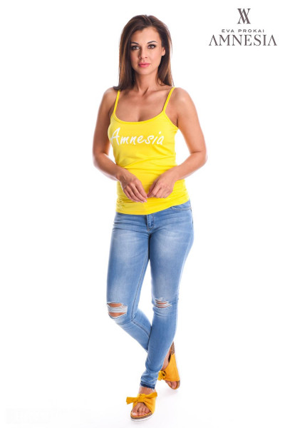 Amnesia Fashion - Eva Prokai top (Spagetti pántos), sárga színben, elején filmnyomott márkajelzéssel a tavaszi/nyári Amnesia kollekcióból.