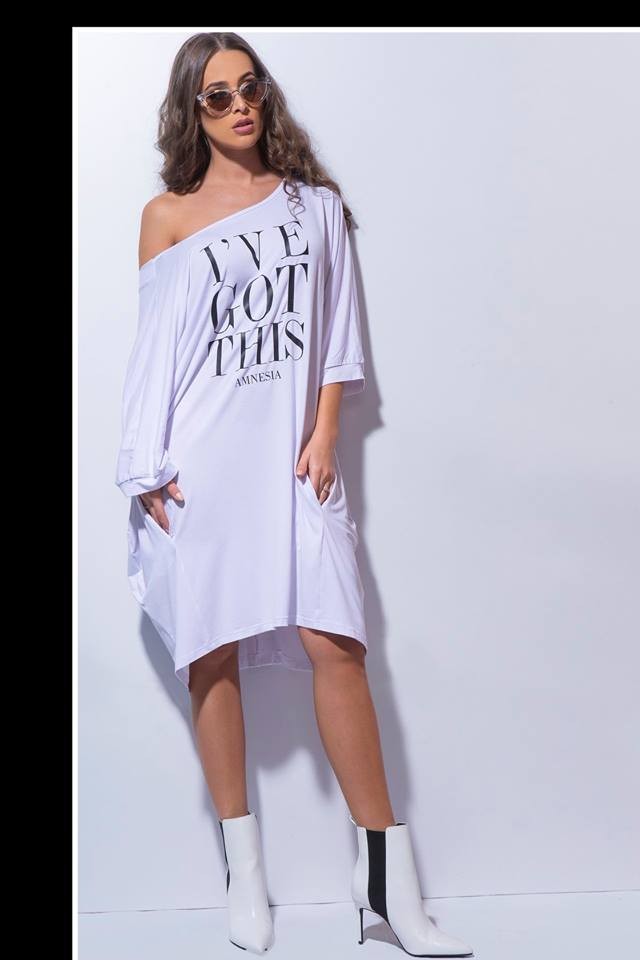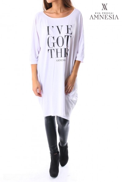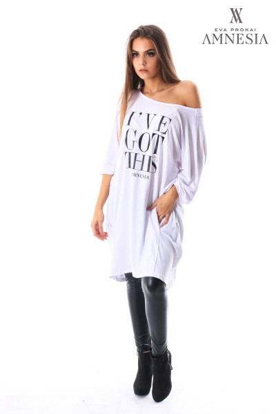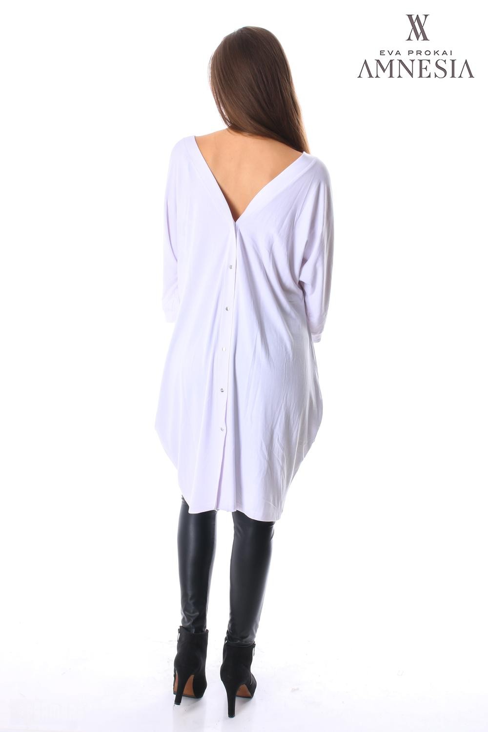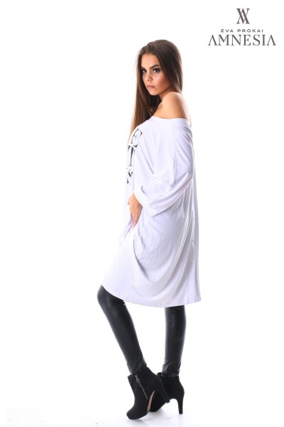 Amnesia Fashion - Eva Prokai tunika (Fanatic) fehér színben, oldalzsebes, hátán enyhén kivágott és patentokkal díszített, elején filmnyomott márkajelzéssel az őszi Amnesia kollekcióból.
