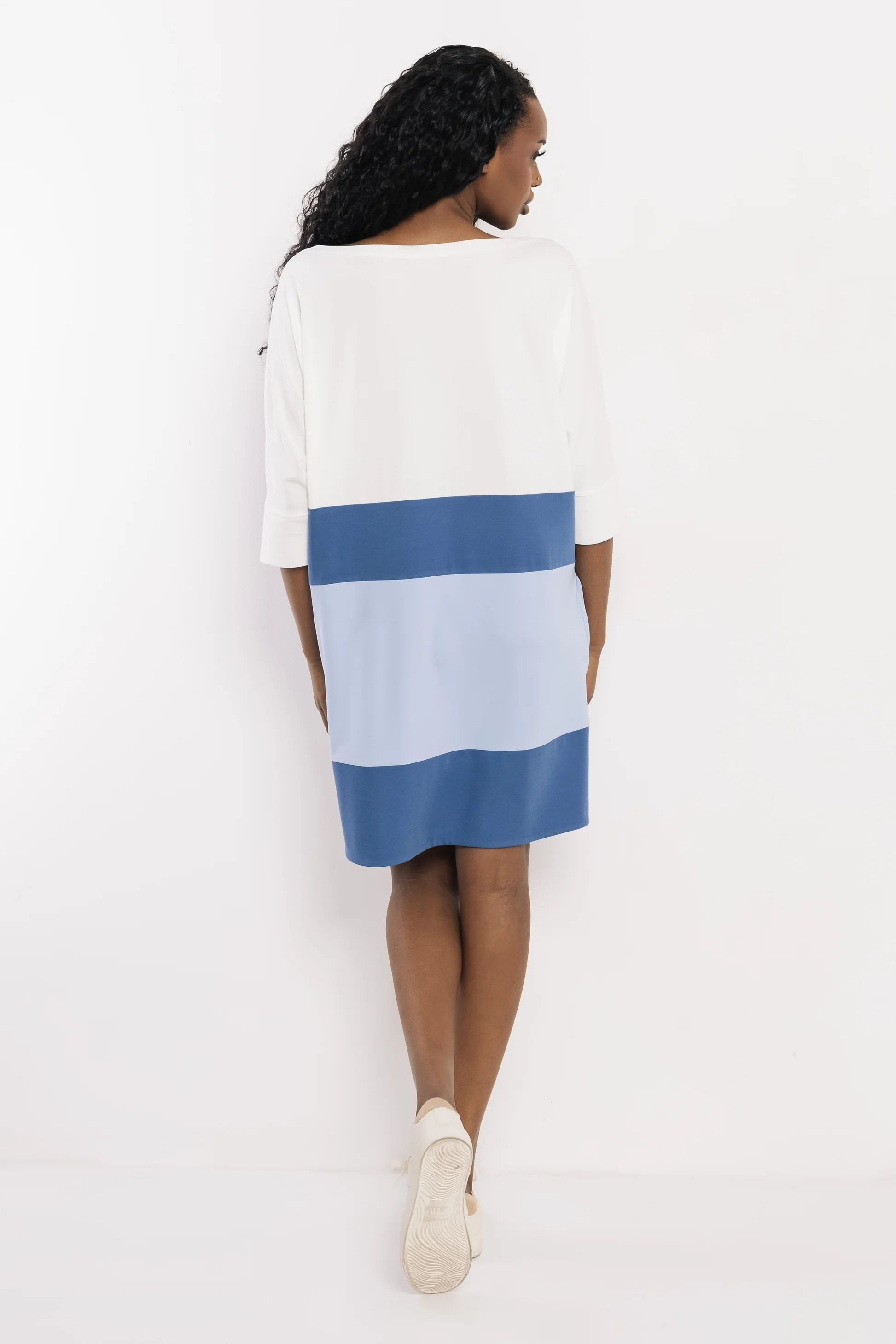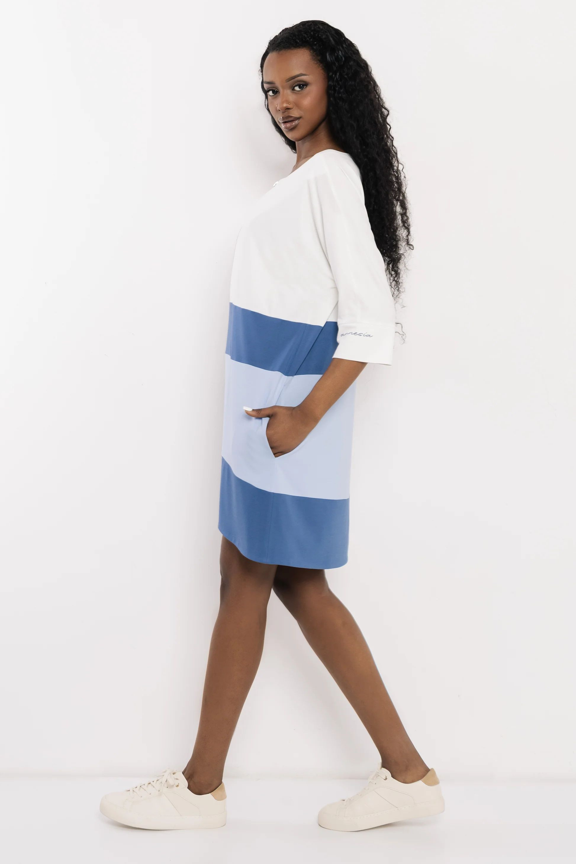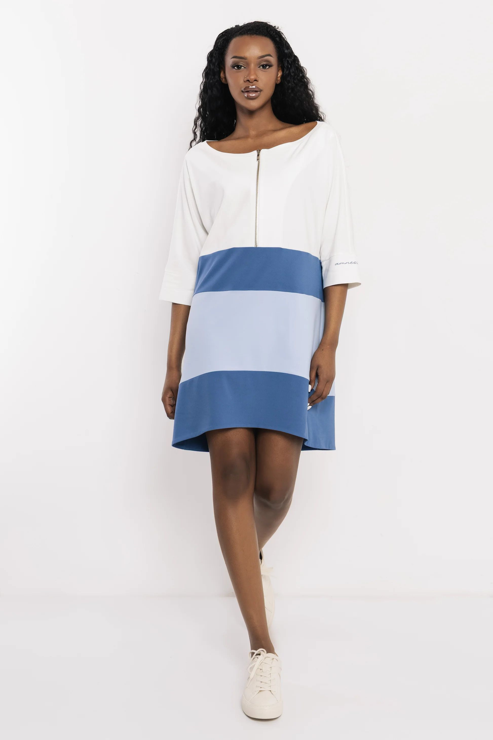Amnesia egyenes szabású tunika, ekrü és kék színben. Felső részén cipzárral, oldalzsebekkel, ujján filmnyomott márkajelzéssel.