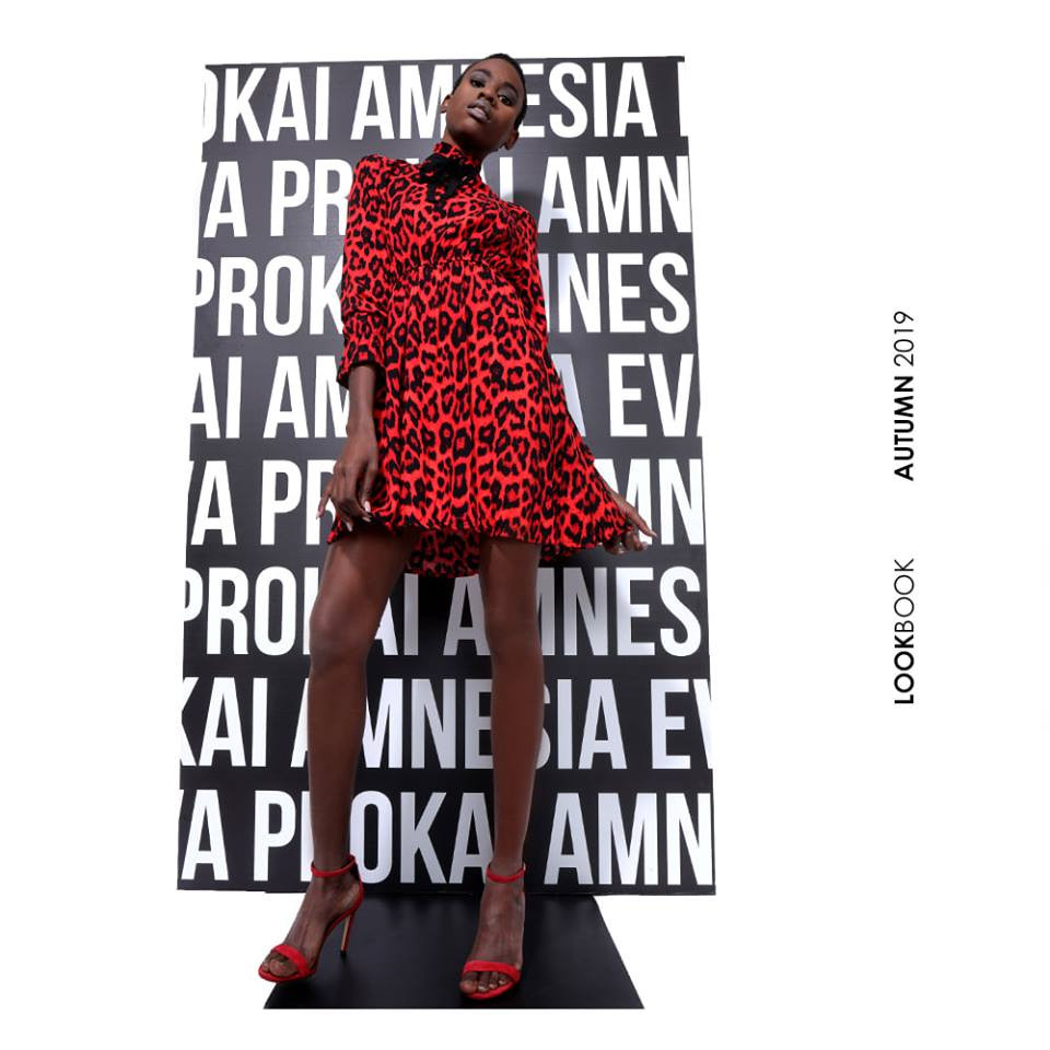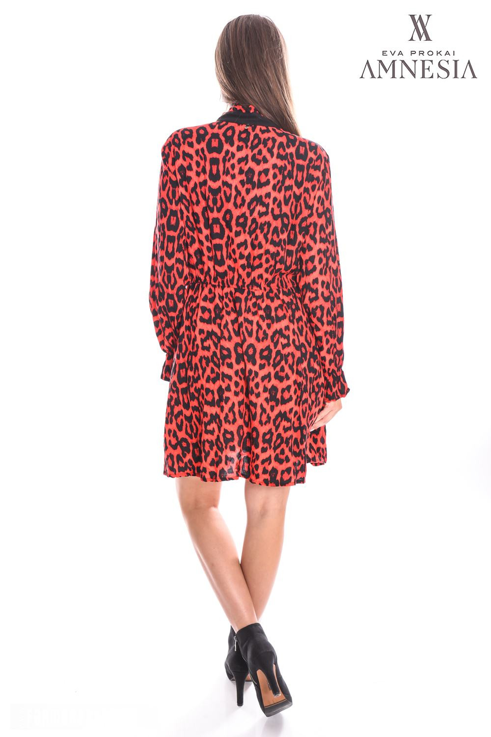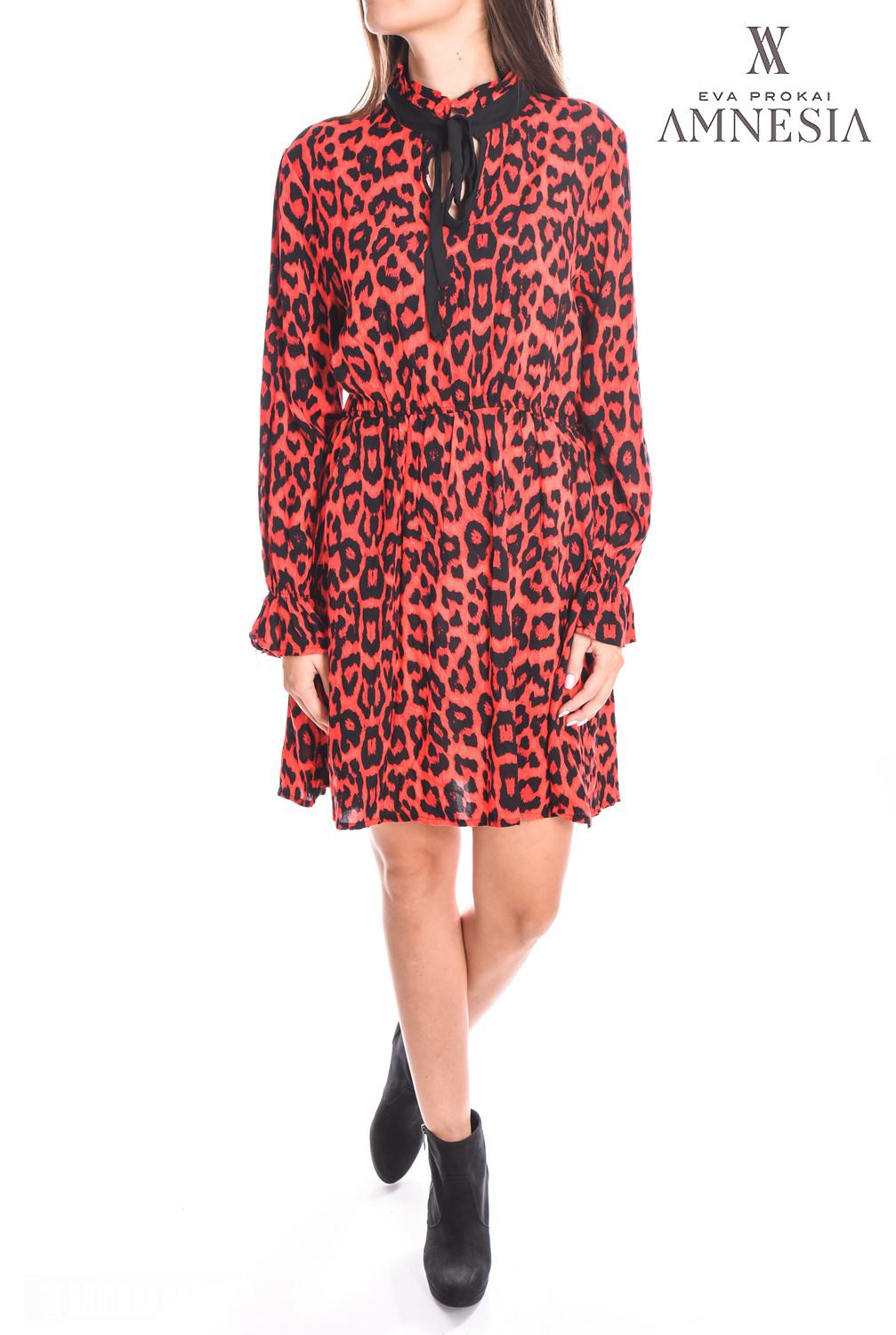 Amnesia Fashion - Eva Prokai tunika (Oci mintás), piros-fekete színben, ocelot mintával, dereka gumis húzott, tölcsér ujjas, nyaka húzott és megköthető, hátán fém márkajelzéssel az őszi/téli Amnesia kollekcióból.