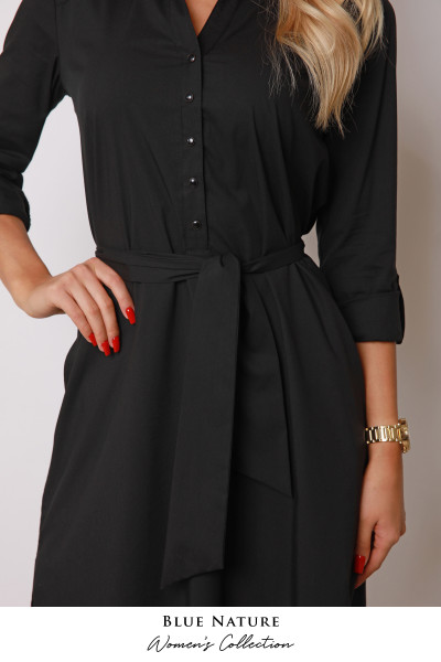 Blue Nature lekerekített aljú ingruha fekete színben; gallérral; elején patentos záródással; felpatentolható ujjakkal; megkötős derékrésszel; oldalán zsebbel; rajta fém-, hajtókáján textil márkajelzéssel az őszi/téli Blue Nature kollekcióból.