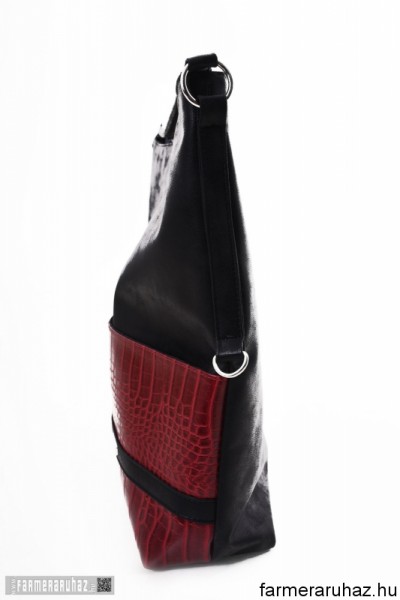 Corrado Martino olasz gyártású rostbőr oldal és válltáska, fekete színű bőr és piros piton mintás bőr kombinációja, belseje egy része és több zsebes, elején ezüst színű fém márkajelzéssel.
