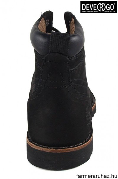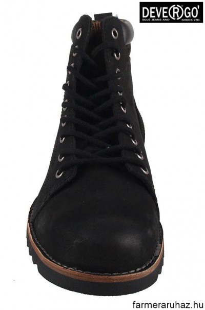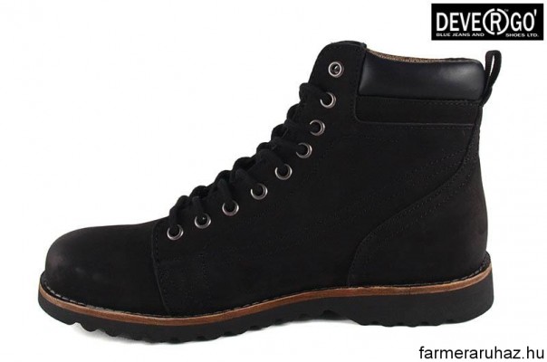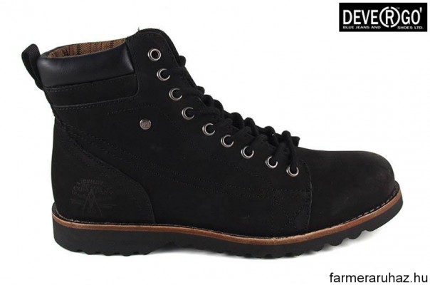 44-es méretű Devergo –Helsinki - bakancs, fekete színben, hajlékony gumitalppal, velúrbőr alapanyagból, sarkánál és nyelvében nyomott márkajelzéssel a DevergoJeans kollekcióból.
