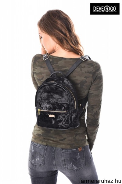 DevergoJeans női bársony anyagú hátitáska fekete színben, tetején zipzárral záródik, állítható pántokkal. Belseje egyterű, egy zipzáras zsebbel és egy bújtatós rekesszel, elején egy zipzáras rekesszel és fém márkajelzéssel az őszi DevergoJeans kollekcióból.