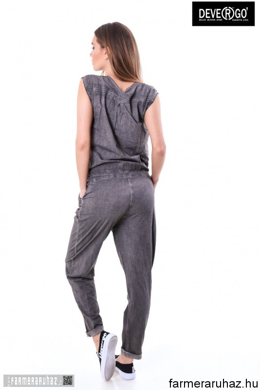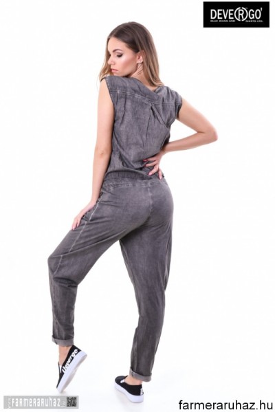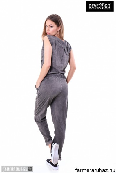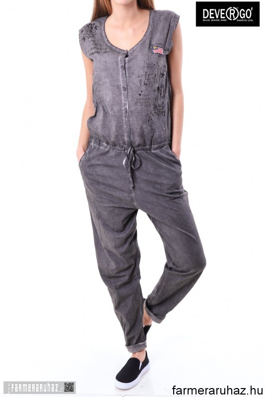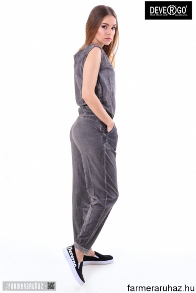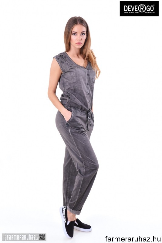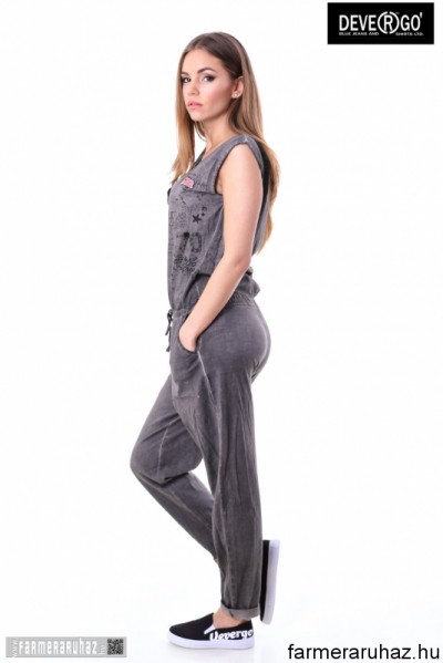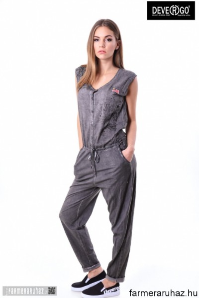 Devergo Jeans női overál, szürke színben, mell részén gombos, dereka gumis és megköthető, oldalzsebes, elején filmnyomott felirattal és márkajelzéssel a 2017. tavaszi DevergoJeans kollekcióból.