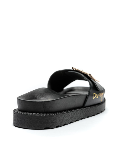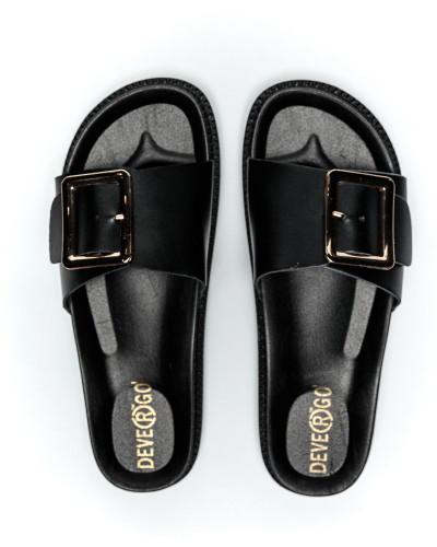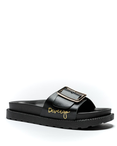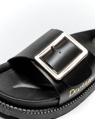 DevergoJeans - Celina - női papucs, fekete színben, kényelmes széles talppal, széles pánttal, rajta nagyméretű ezüst színű fém csattal, pánt részén arany színű nyomott márkajelzéssel a tavaszi/nyári DevergoJeans kollekcióból.