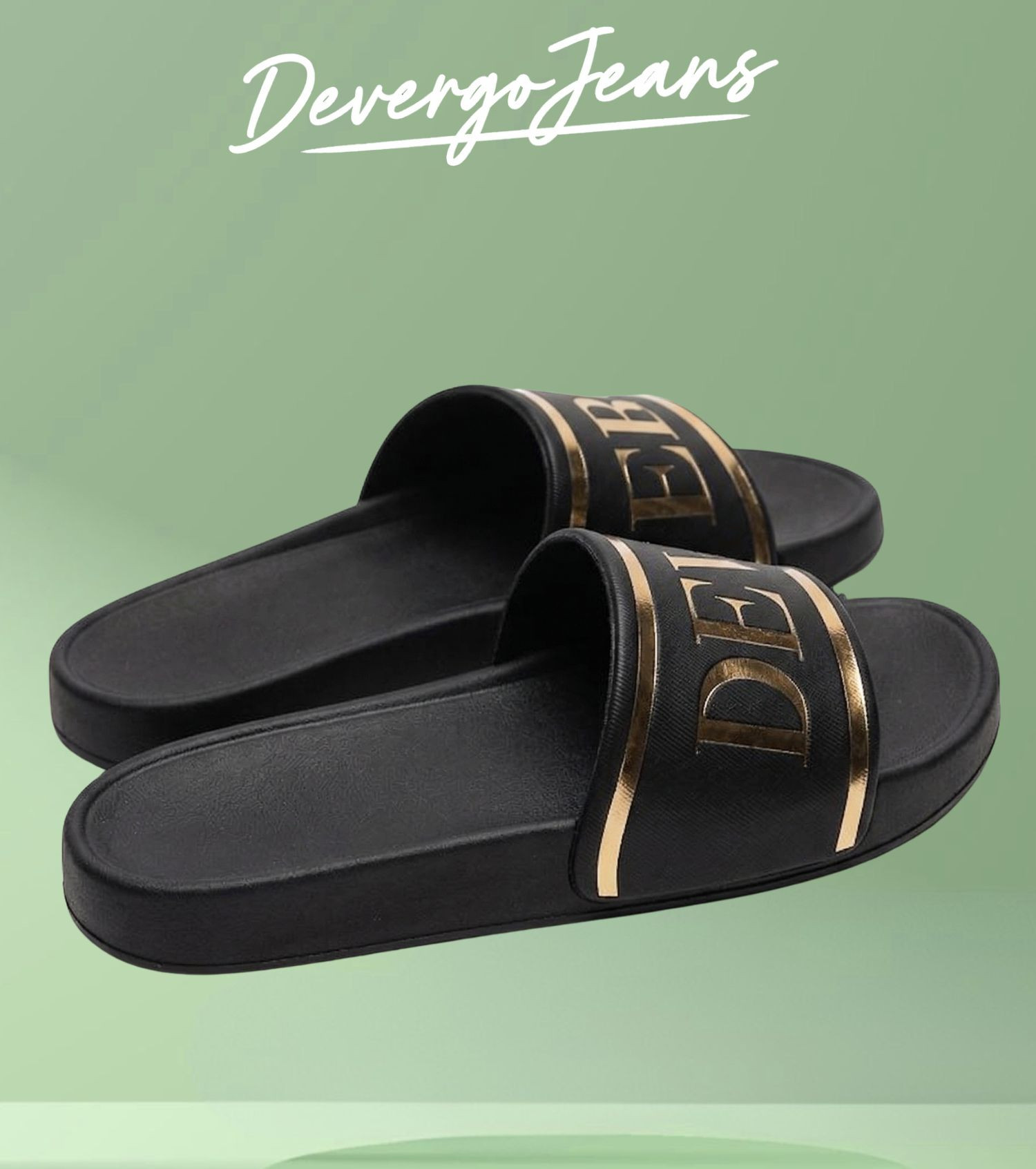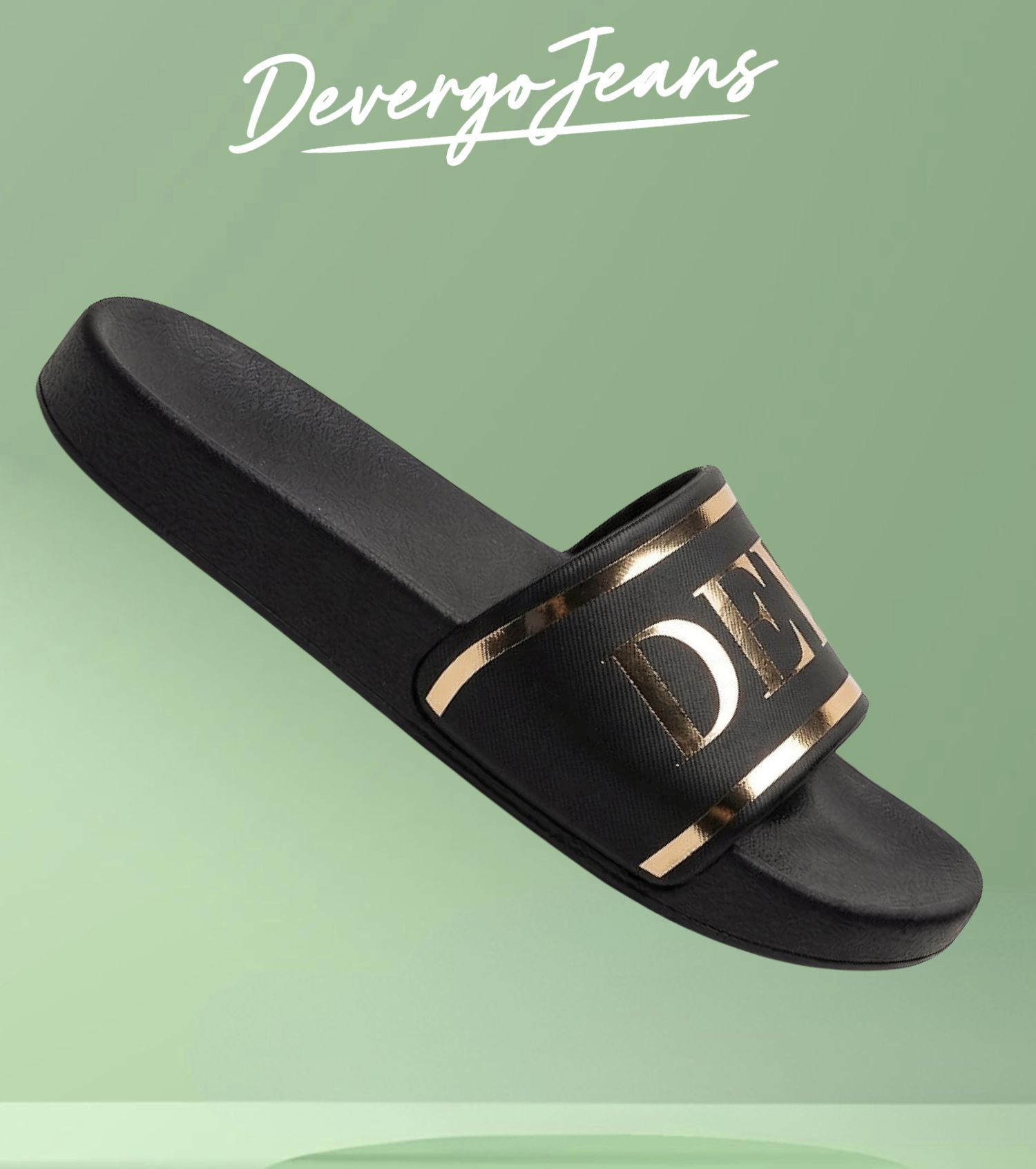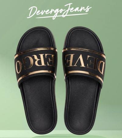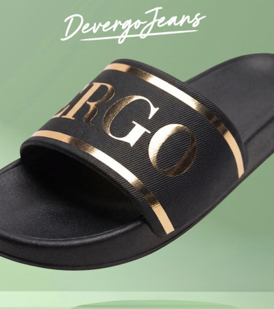 Ez a letisztult női papucs fényes arany DEVERGO logóval díszített pántot kapott, amely karakteres, divatos megjelenést kölcsönöz. Könnyű, mérsékelten vízálló és kényelmes viselet, ideális választás nyári napokra a parton vagy a városban.
