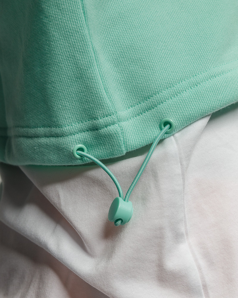 DevergoJeans női cropp fazonú pulóver, menta színben. Laza szabással, kapucnival és két oldalt összehúzható derék résszel, mell részén filmnyomott mintával és márkajelzéssel.