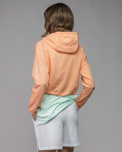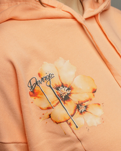 DevergoJeans női cropp fazonú pulóver, narancssárga színben. Laza szabással, kapucnival és két oldalt összehúzható derék résszel, mell részén filmnyomott mintával és márkajelzéssel.