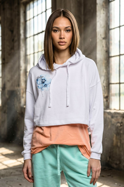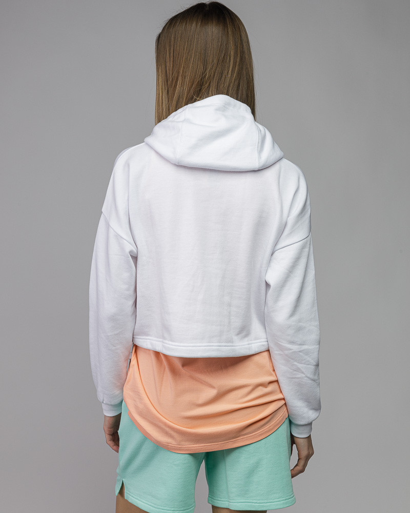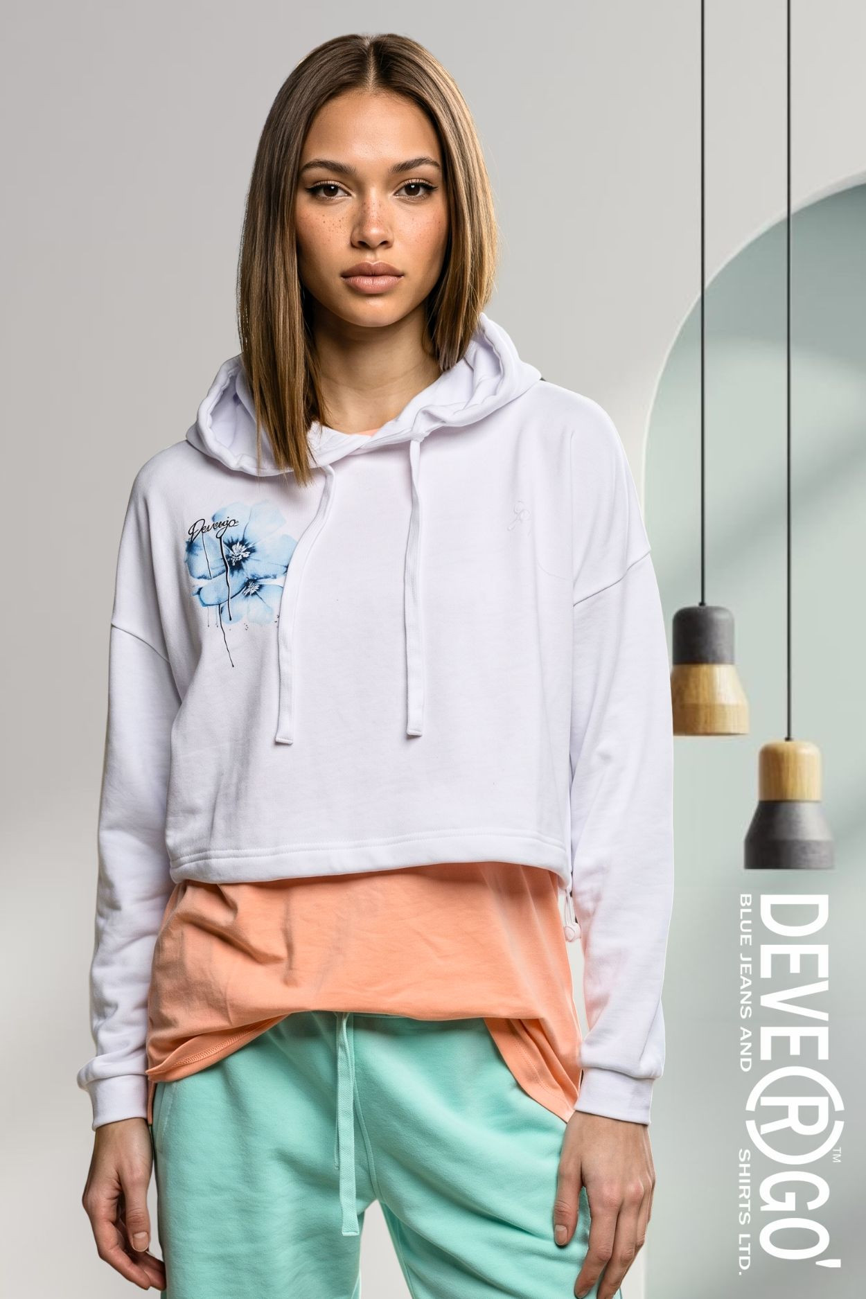 DevergoJeans női cropp fazonú pulóver, fehér színben. Laza szabással, kapucnival és két oldalt összehúzható derék résszel, mell részén filmnyomott mintával és márkajelzéssel.