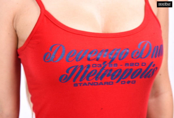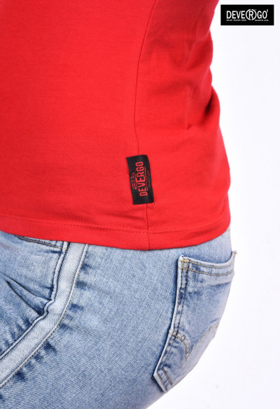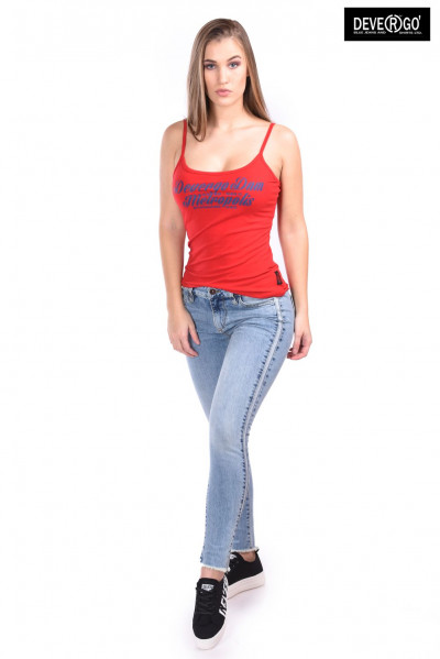 Devergo Jeans női spagetti pántos top, piros színben, elején filmnyomott, - alján rávarrt márkajelzéssel a tavaszi DevergoJeans kollekcióból.