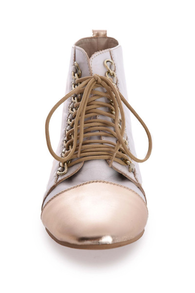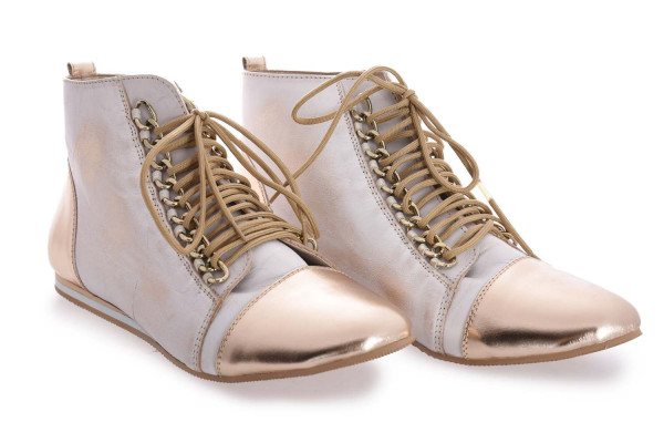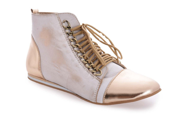 Újdonság! Európai gyártású Di Lusso olasz bőr alapanyagú félcipő, arany és fehér színben, fűzőjénél lánc díszítéssel, nyelvén nyomott márkajelzéssel.
