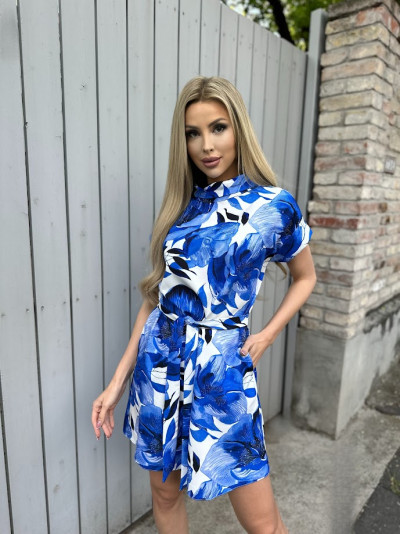Envy Fashion női ruha, ekrü színben, színes, kék virág mintával, egyenes szabással, kámzsanyakkal, rejtett oldalzsebbel, hátán cipzáras záródással, anyagából szabott megkötővel.