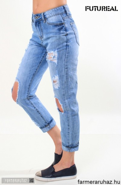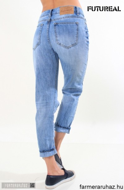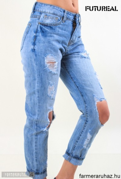 Futureal farmernadrág, kék színben, koptatott és szaggatott fzaonban, oldal-és farzsebes, derekán varrott márkajelzéssel a 2016. tavaszi Futureal kollekcióból.