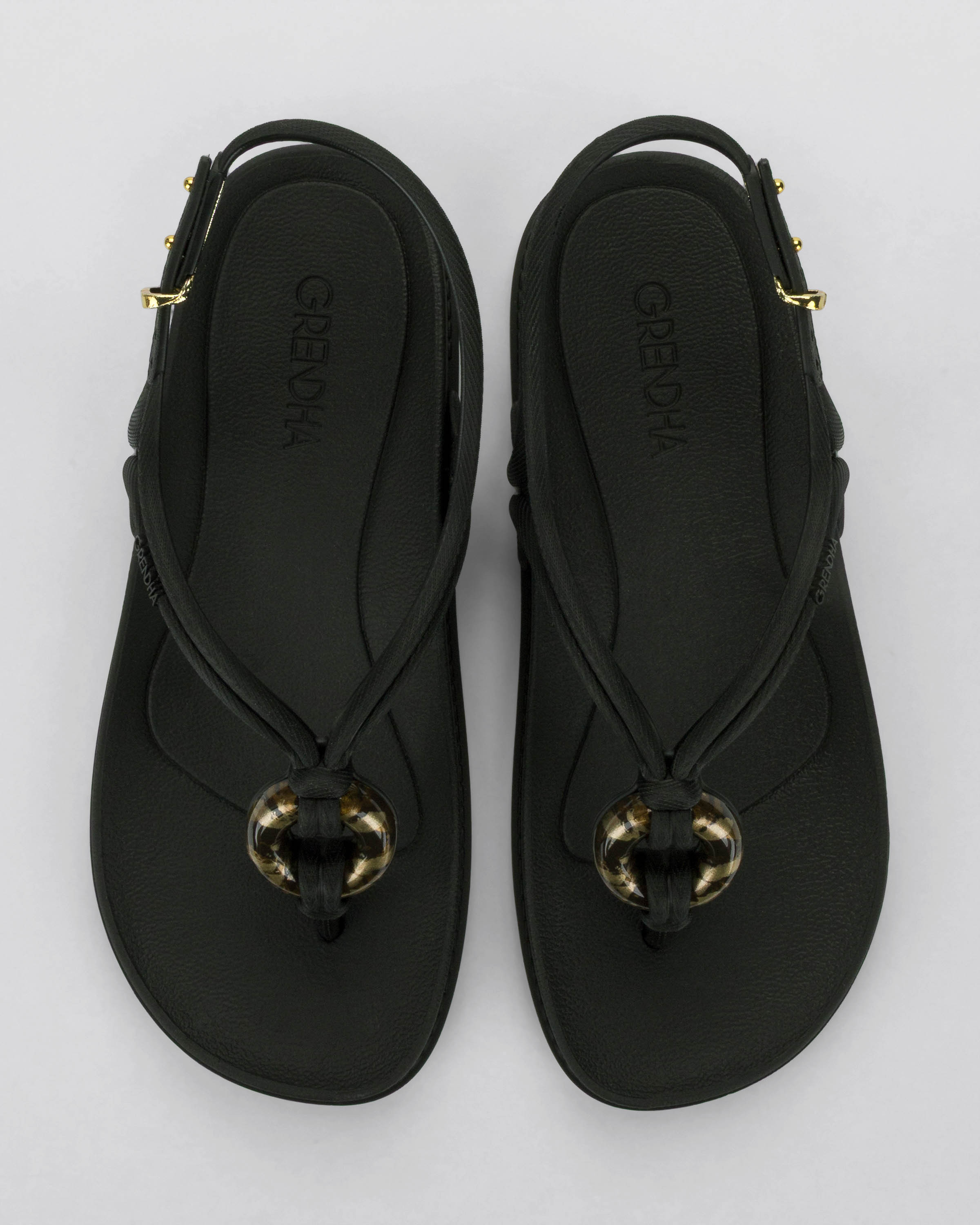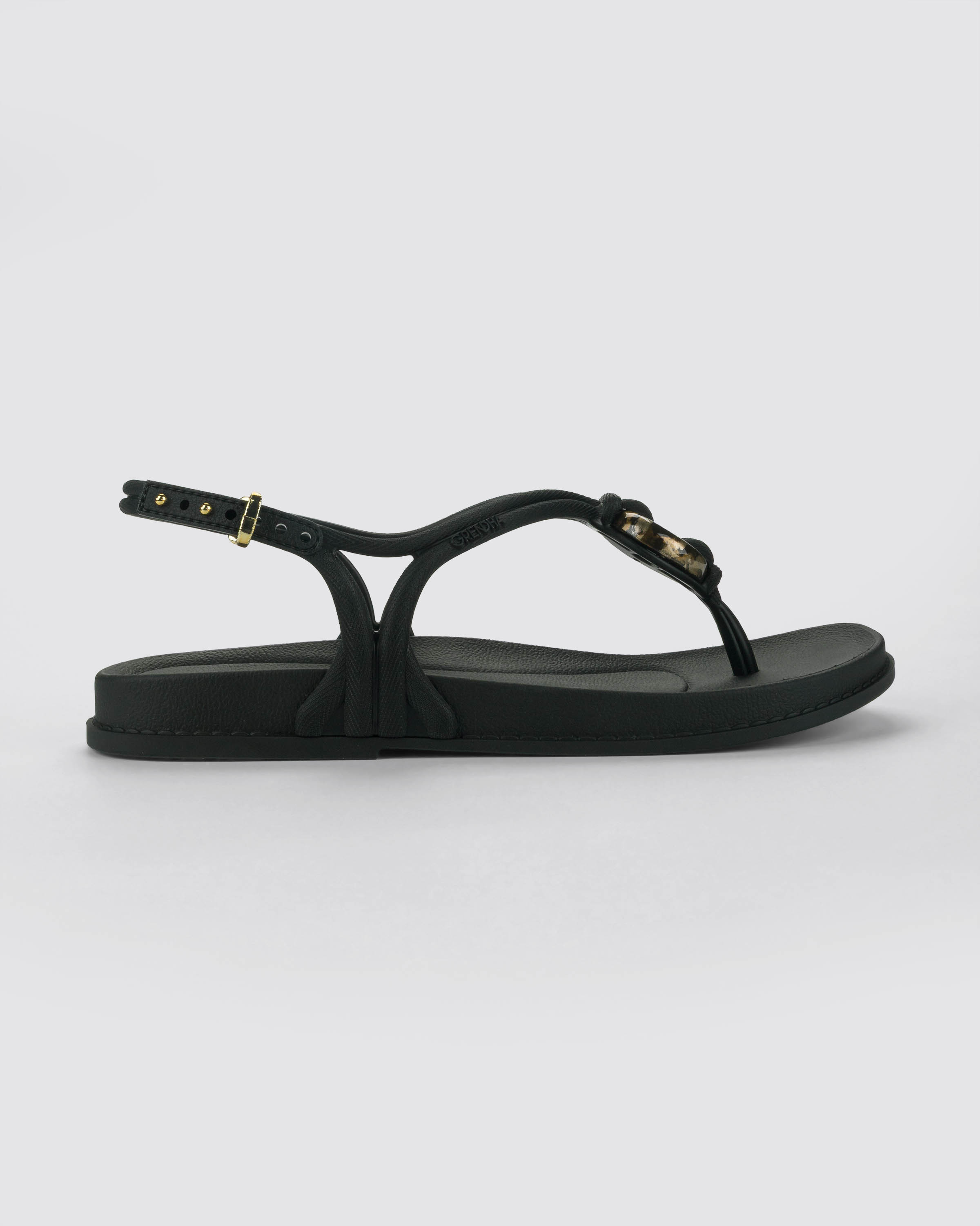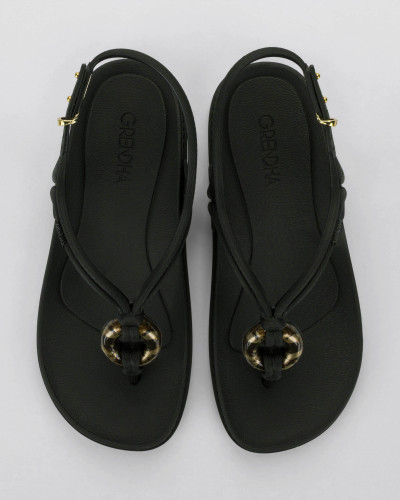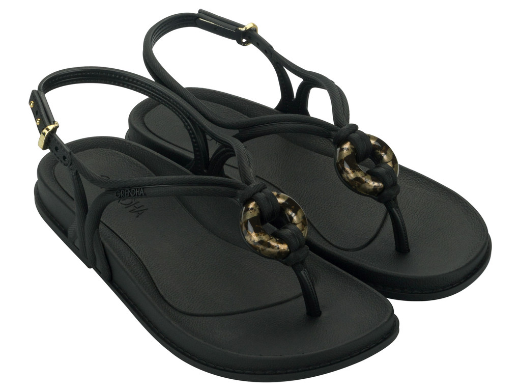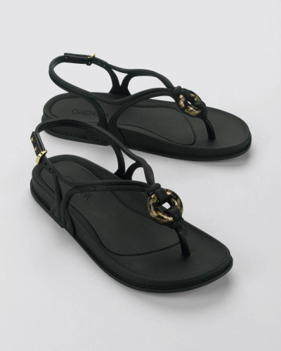 Ipanema által forgalmazott Grendha márkájú női szandál, fekete színben, speciális, rugalmas és tartós műanyagból, vékony talppal, kötél hatású állítható pántján díszítéssel és nyomott márkajelzéssel.