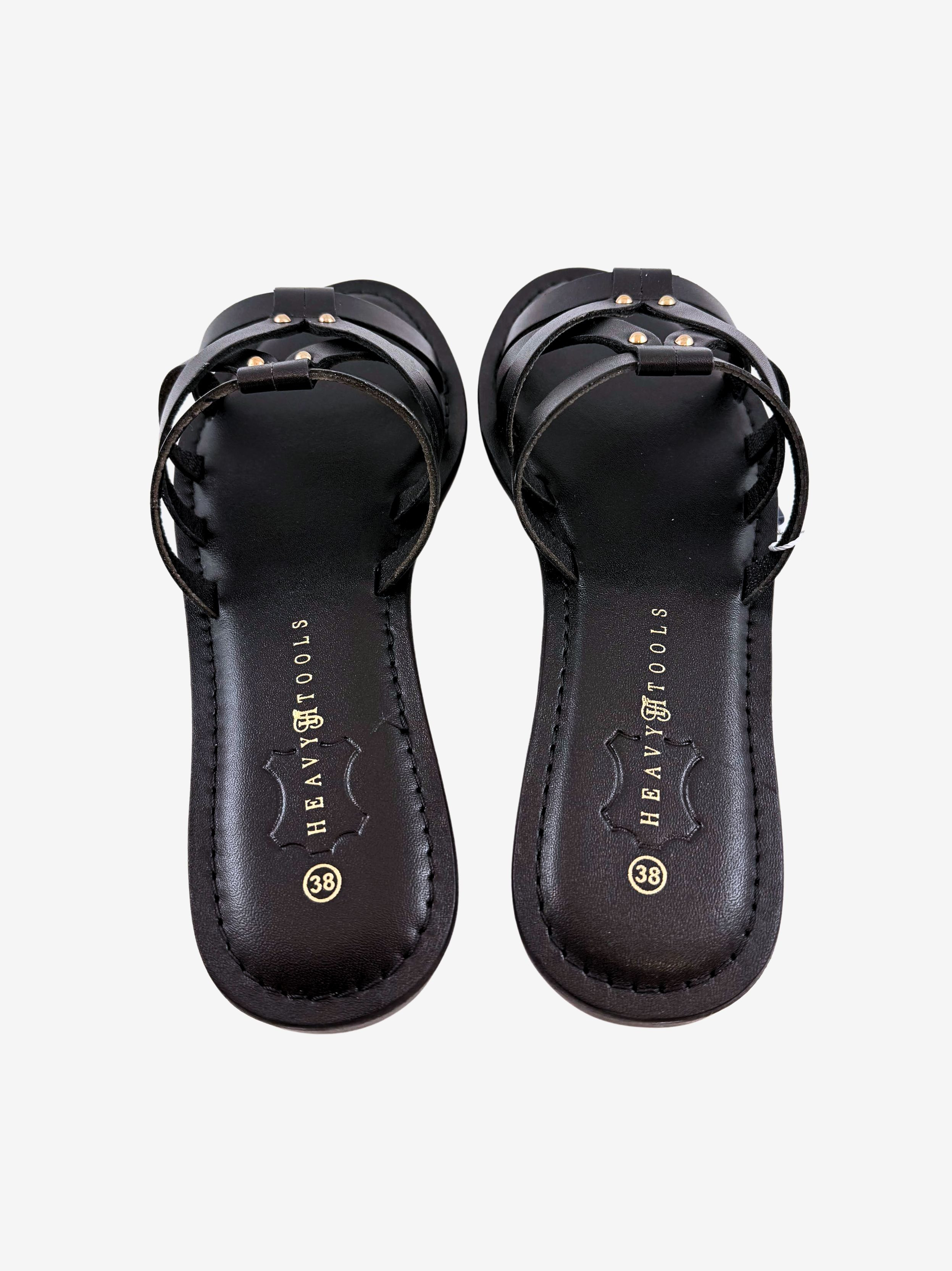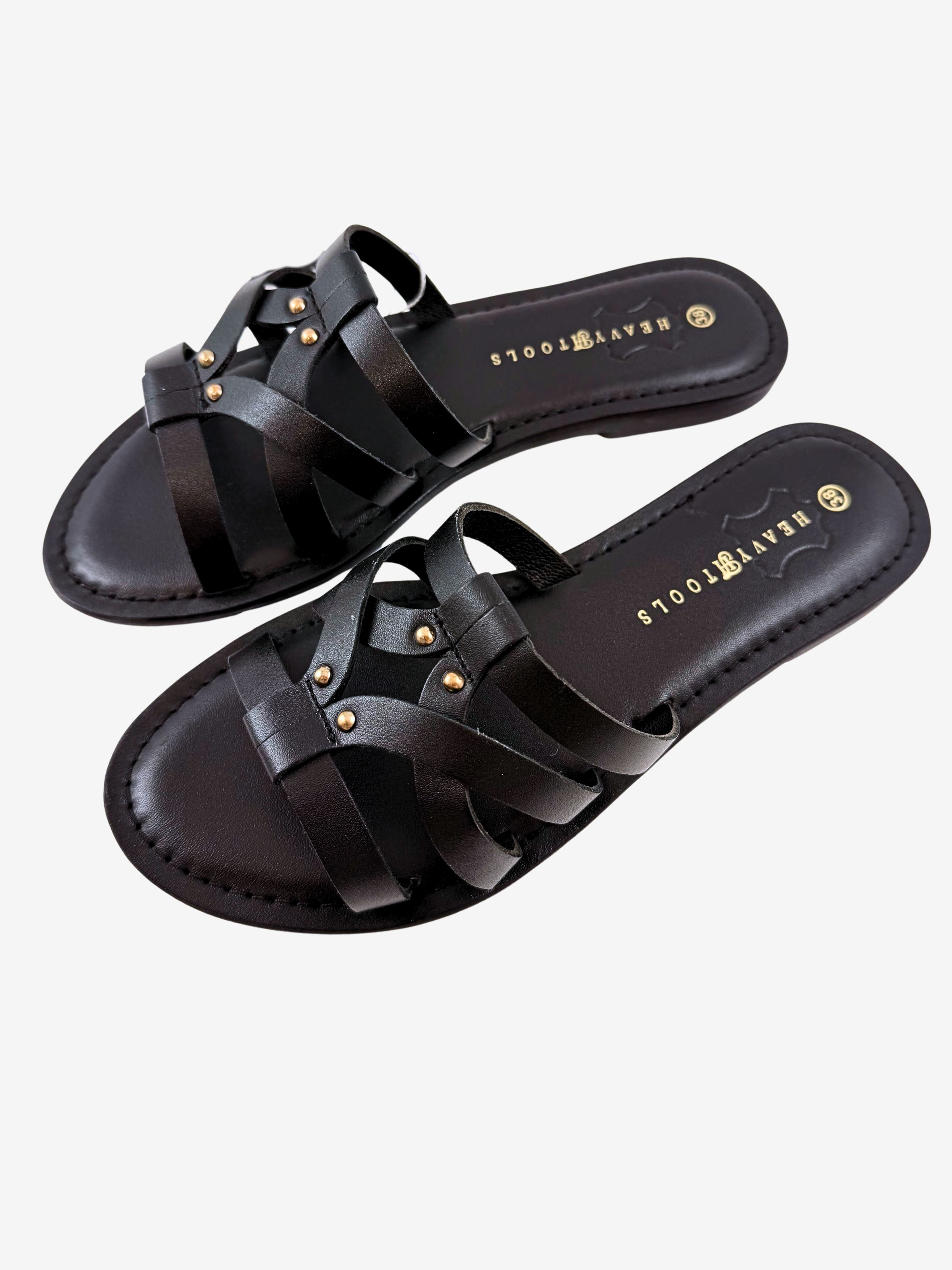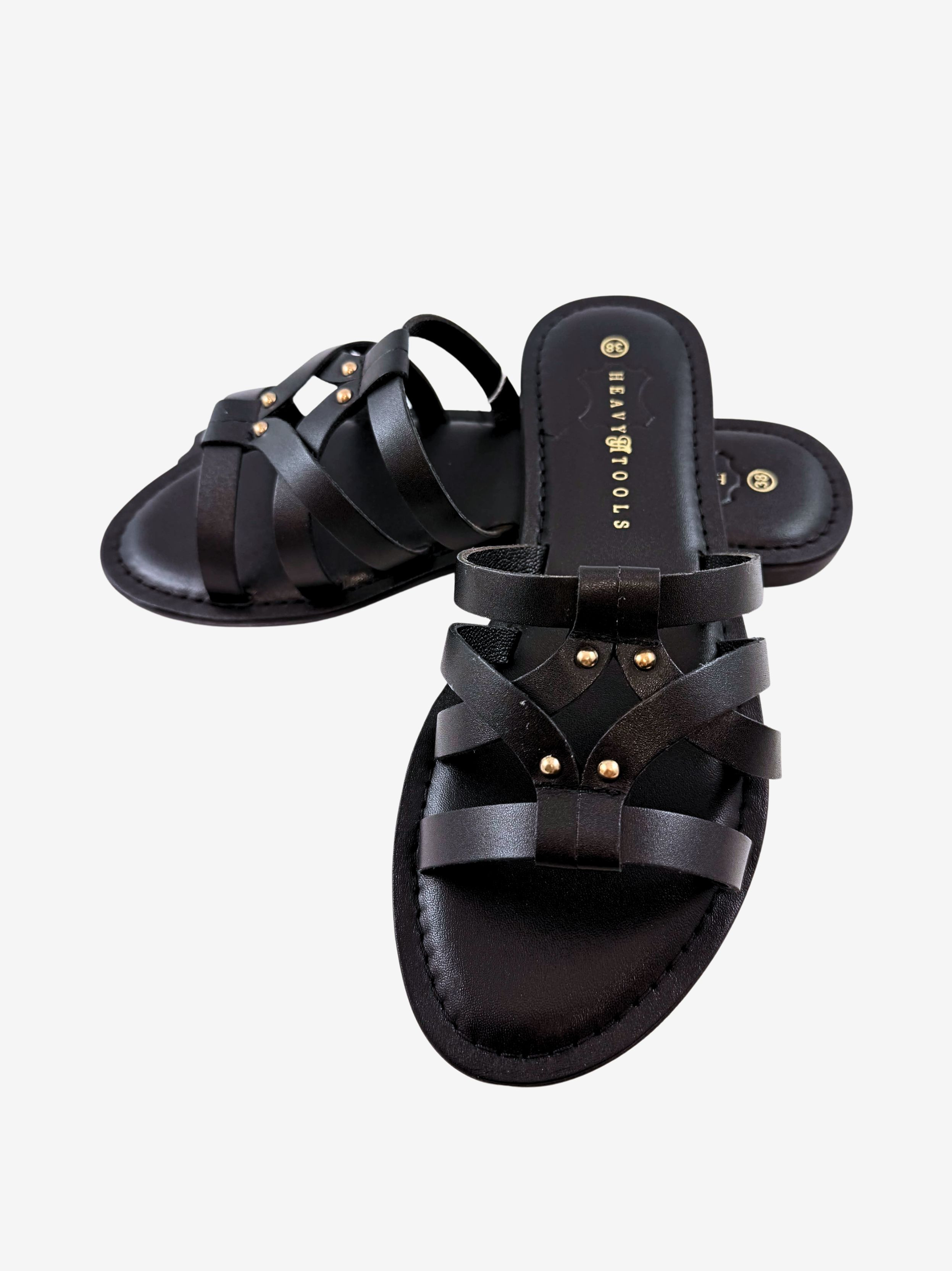 Heavy Tools bőrből készült papucs, fekete színben. Csúszásgátló gumi talppal, pántján szegecses díszítéssel.