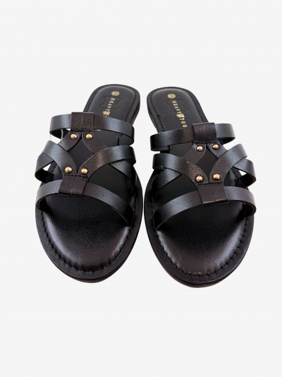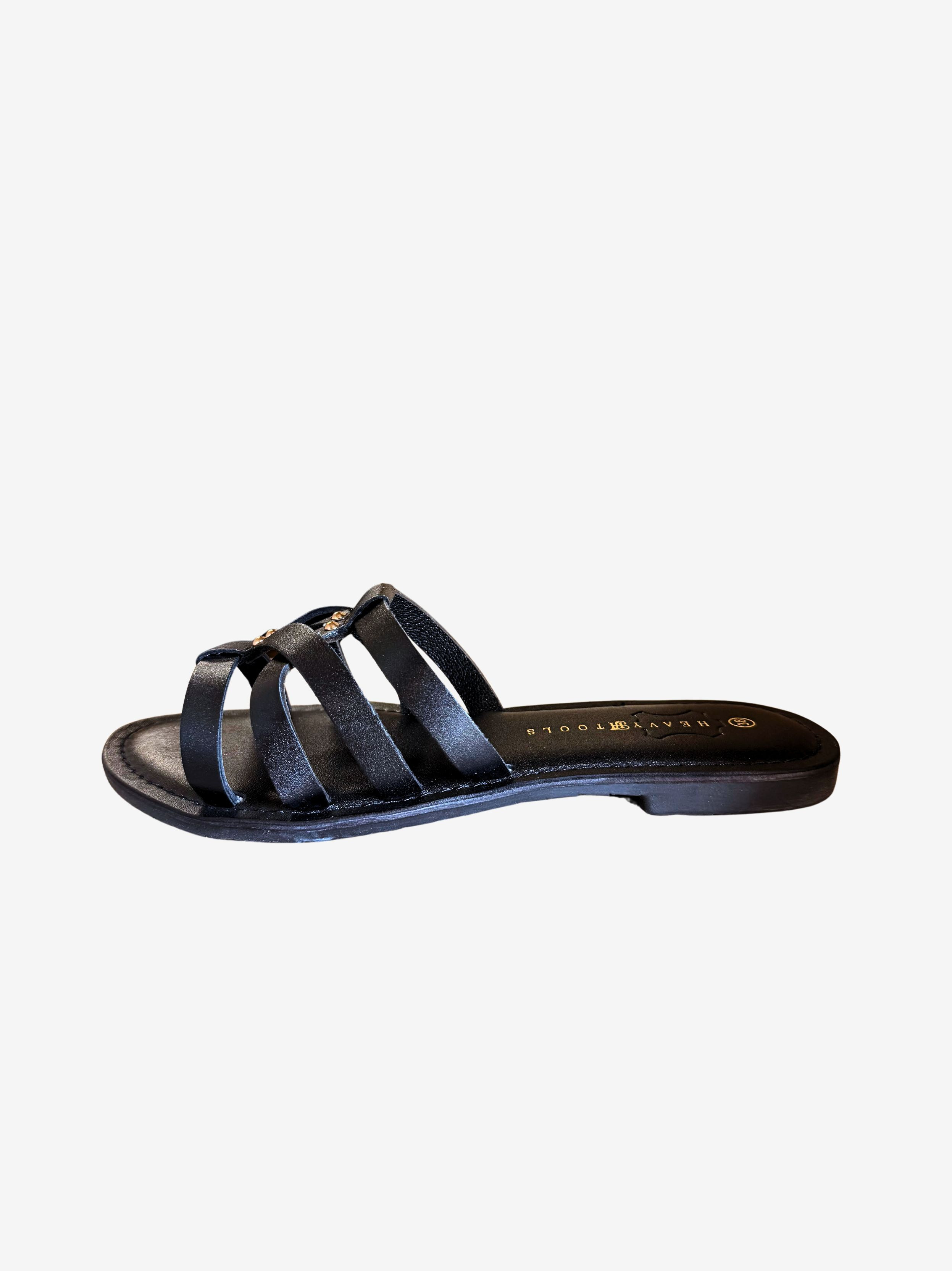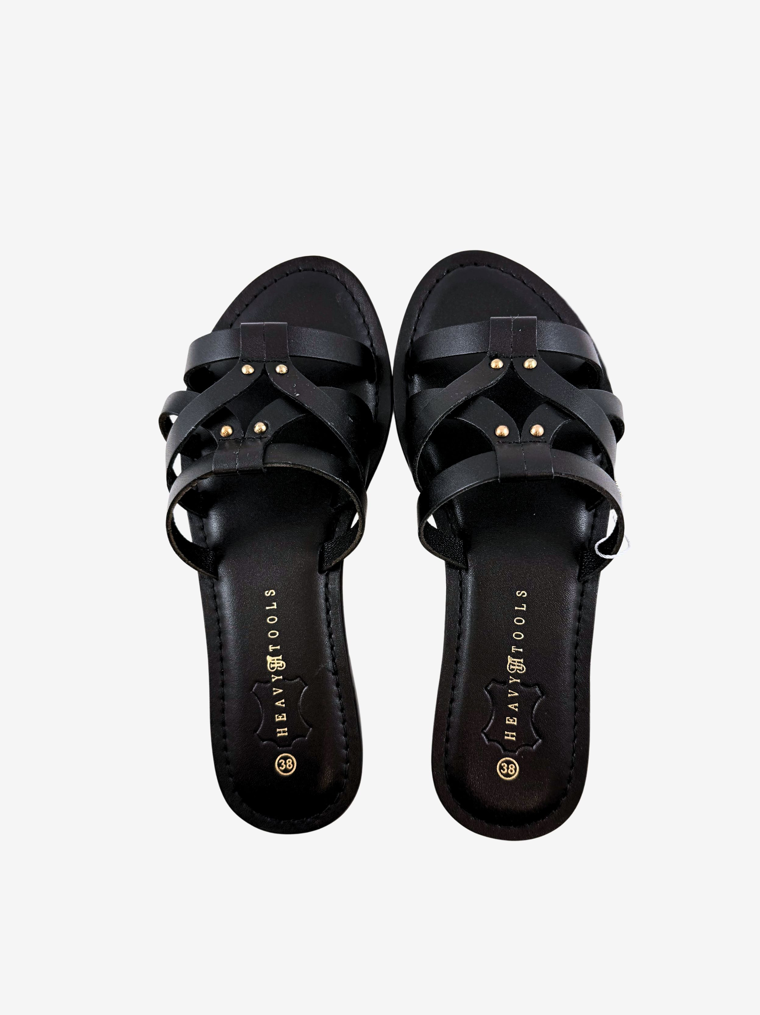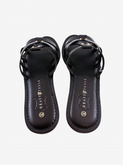 Heavy Tools bőrből készült papucs, fekete színben. Csúszásgátló gumi talppal, pántján szegecses díszítéssel.
