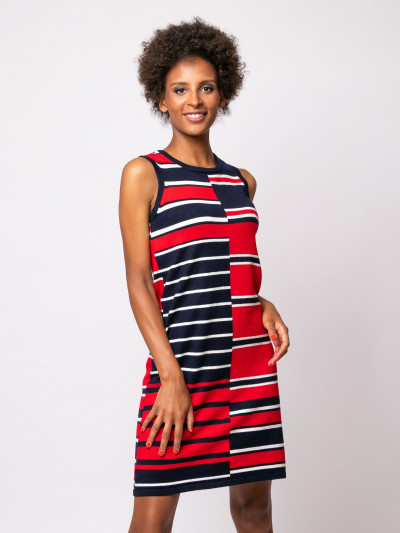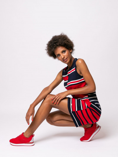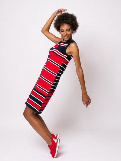 Heavy Tools finom kötött ujjatlan ruha, piros-sötétkék és fehér színben, alján fém márkajelzéssel a tavaszi Heavy Tools kollekcióból.