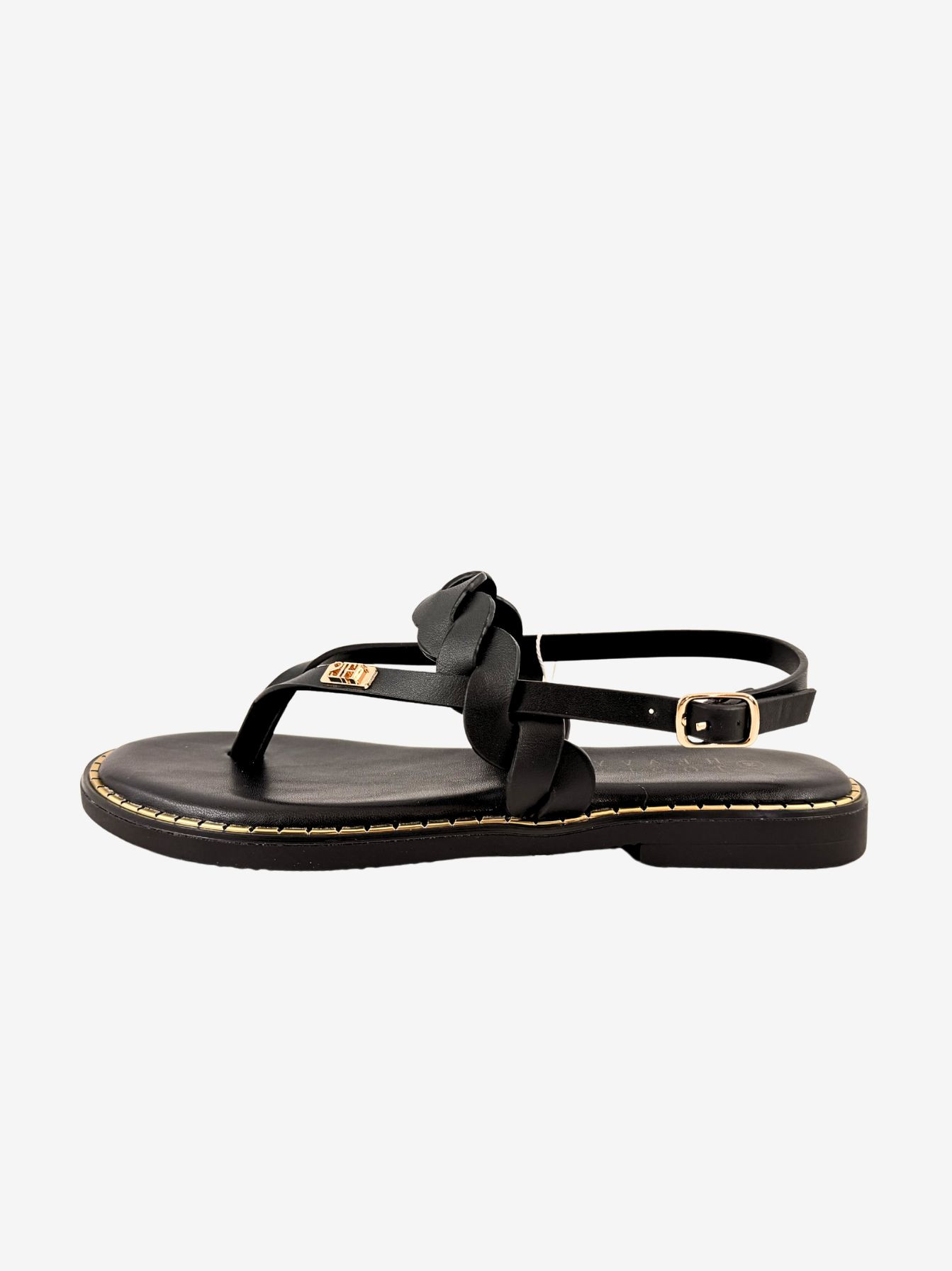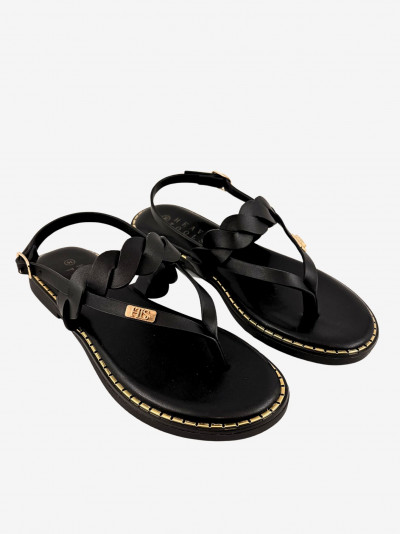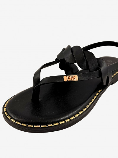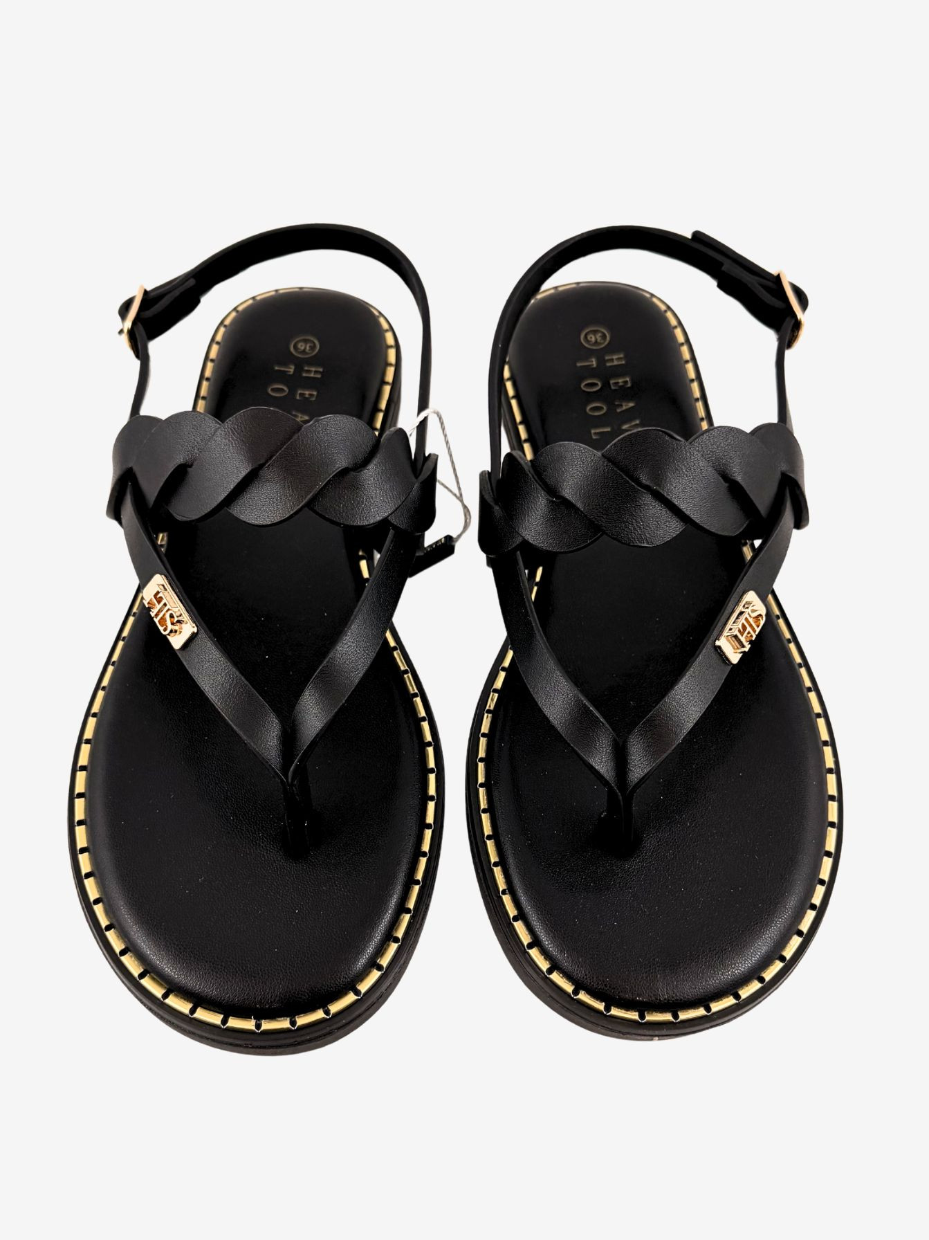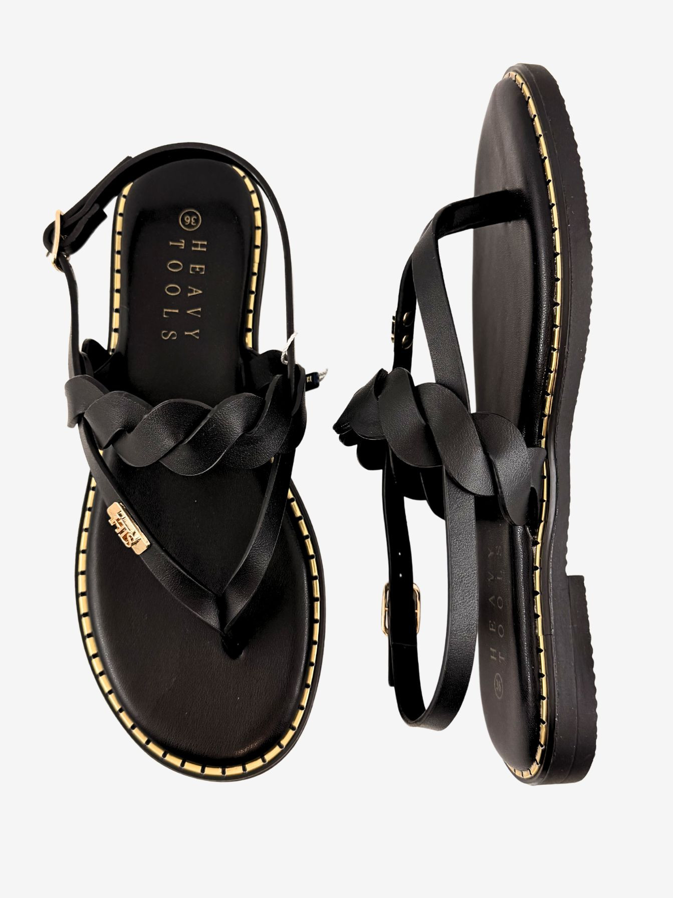Heavy Tools női szandál, fekete színben, lábujj közes kialakítással, 2 sima és egy fonott hatású kereszt pánttal. Több méretben állítható záródással. pántján fém márkajelzésel.