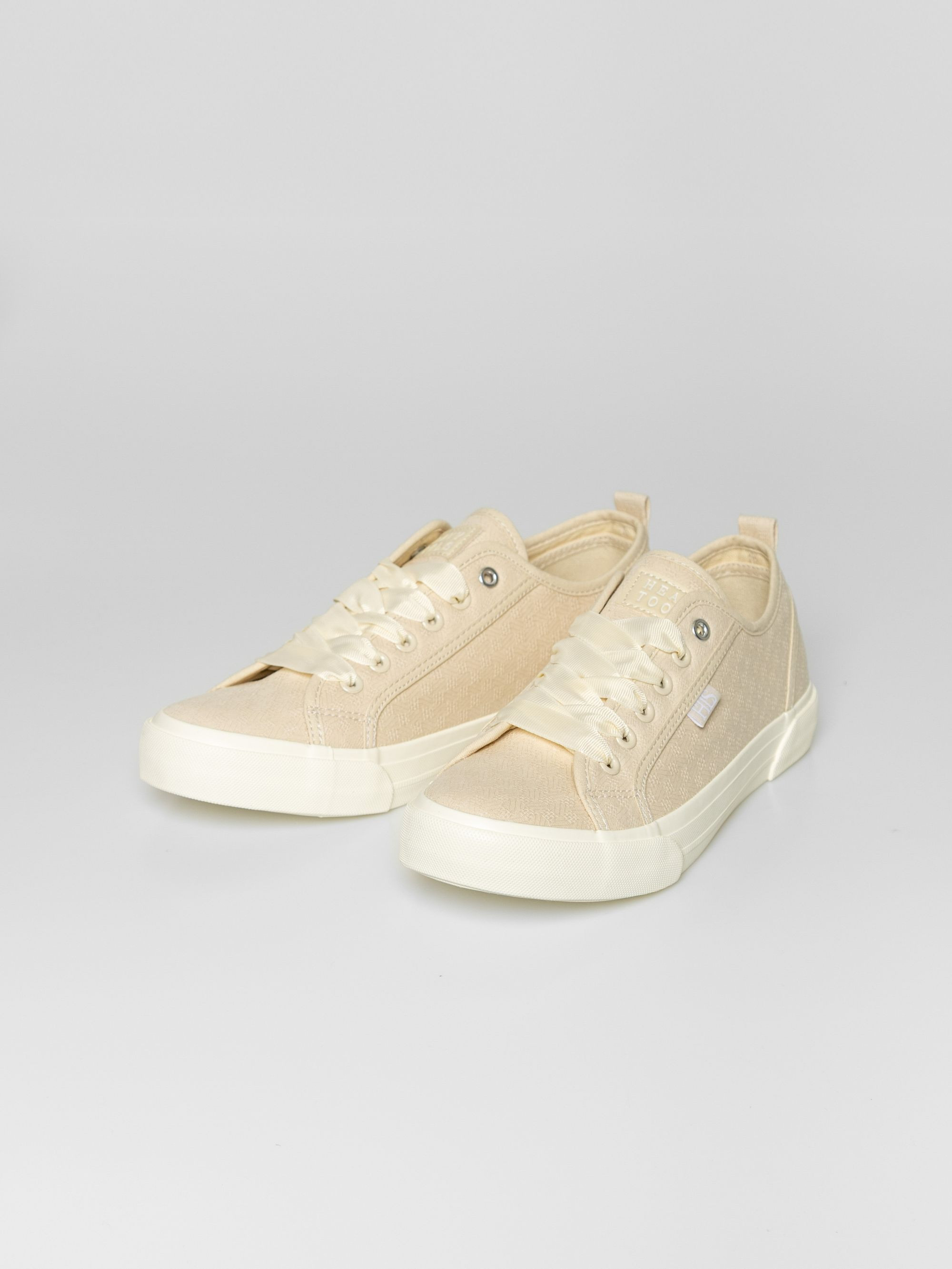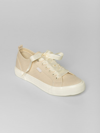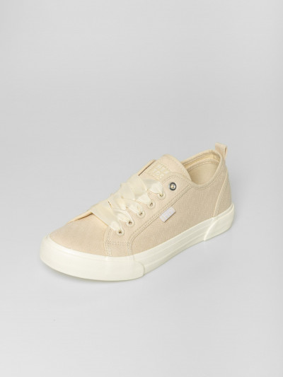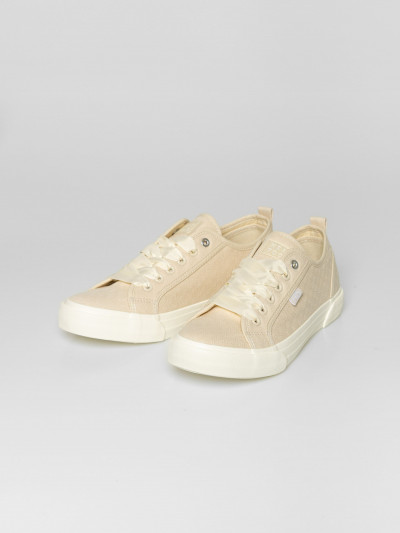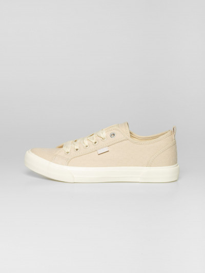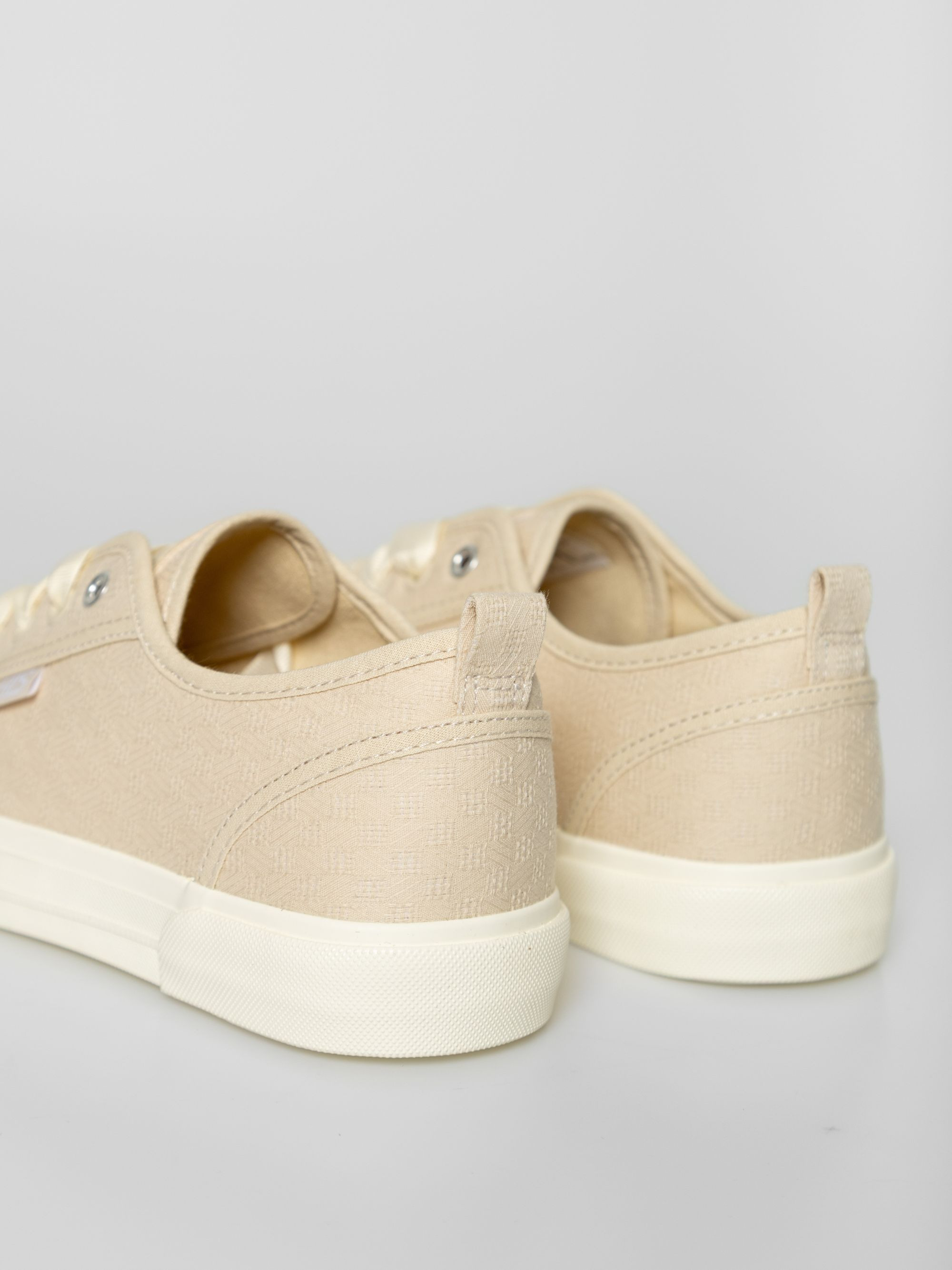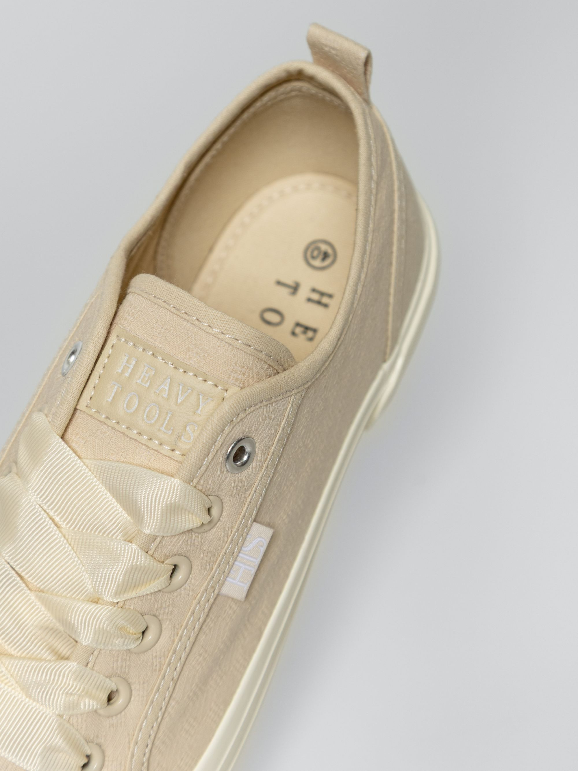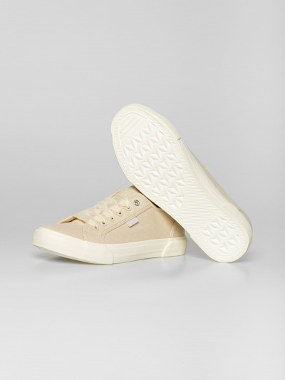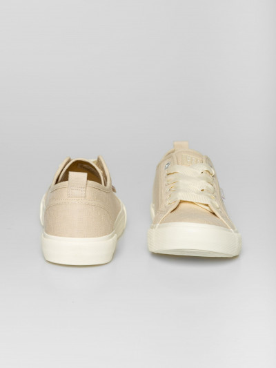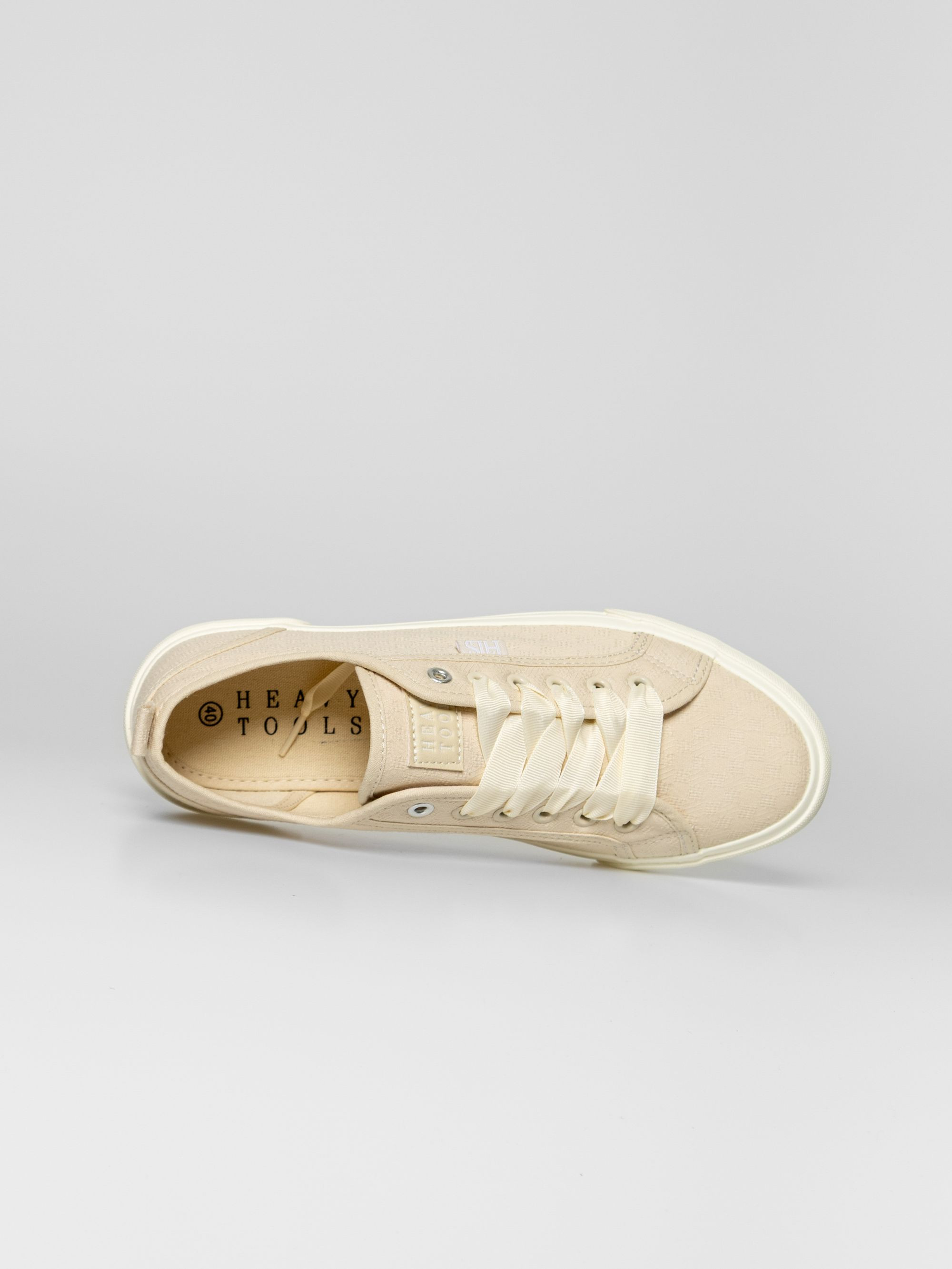 Heavy Tools anyagában mintás női vászoncipő, homok színben. Csúszásgátló gumi talppal, vastag szallag fűzővel, nyelvén és oldalán márkajelzéssel.
