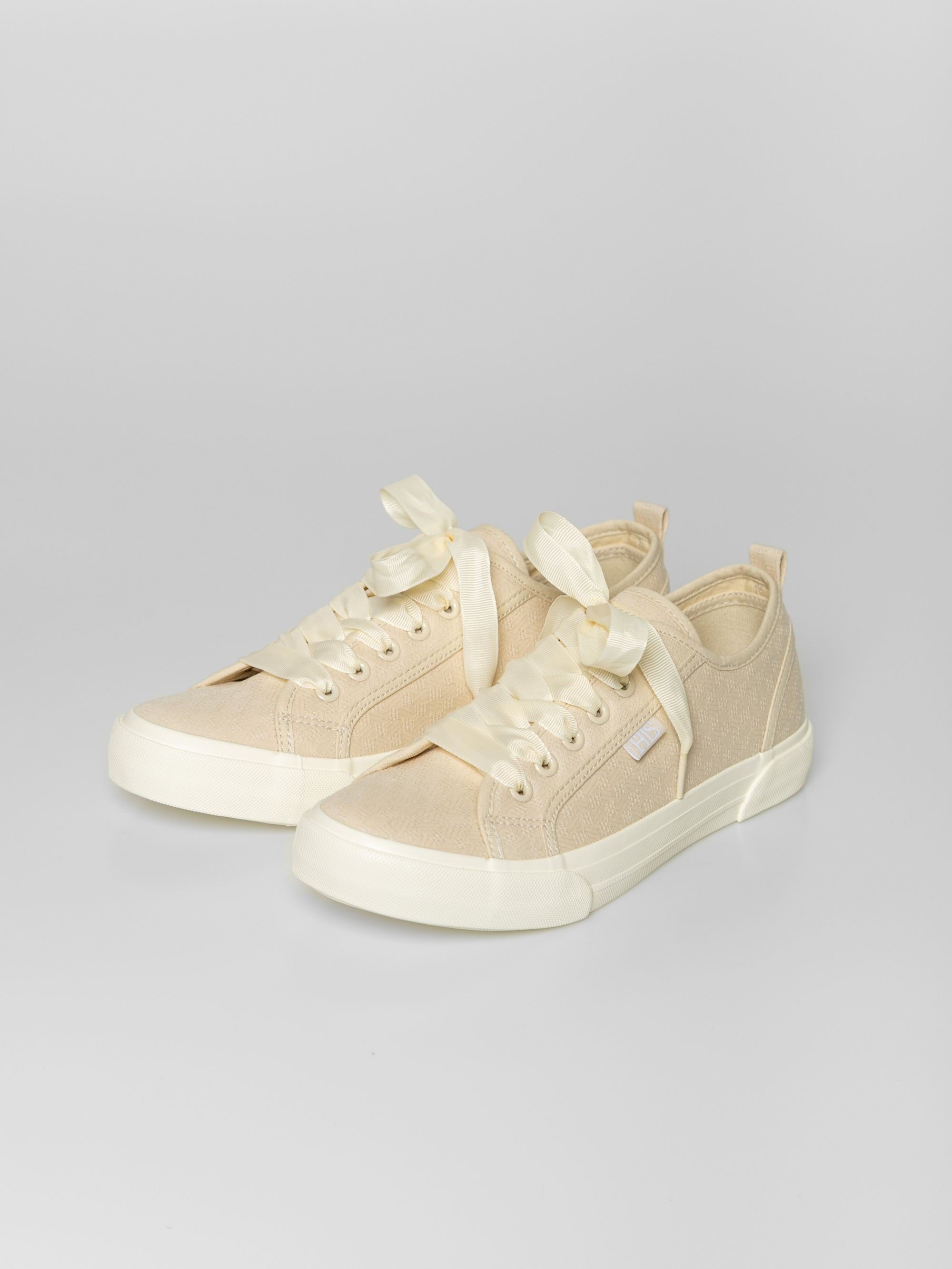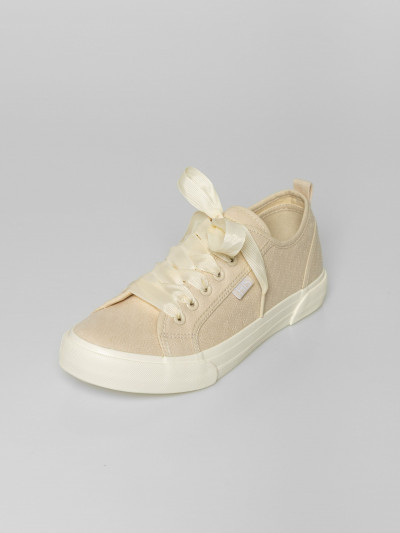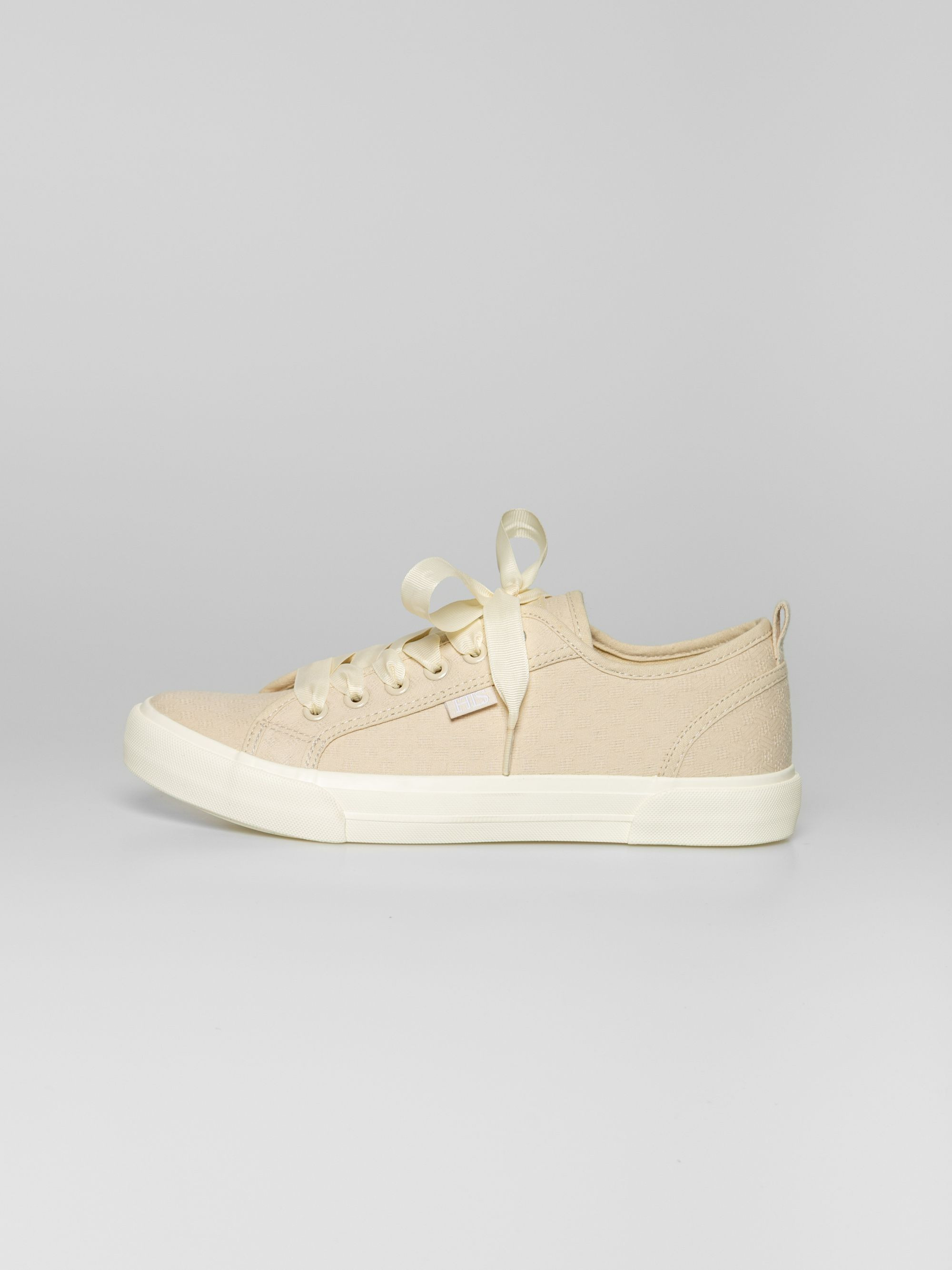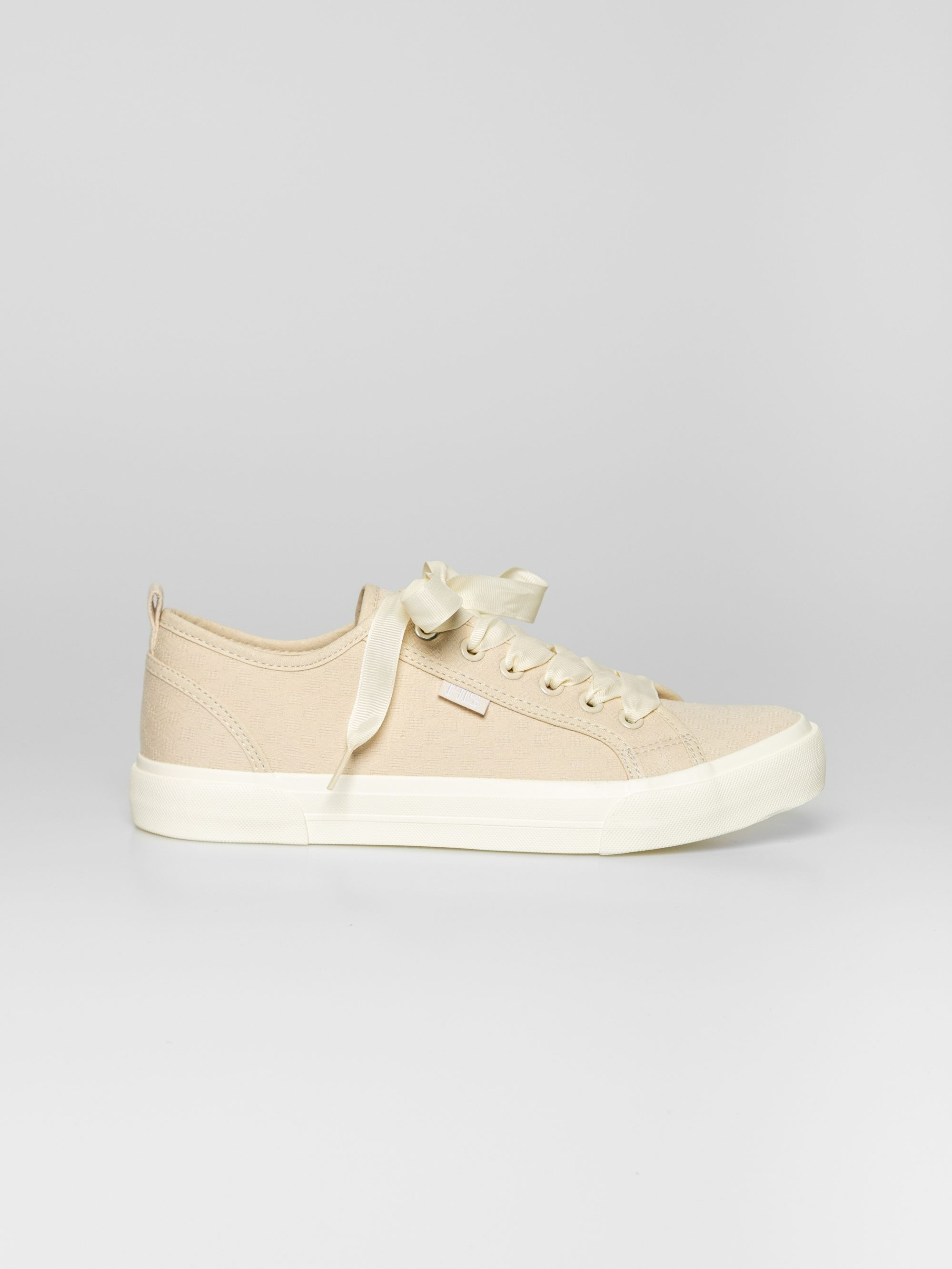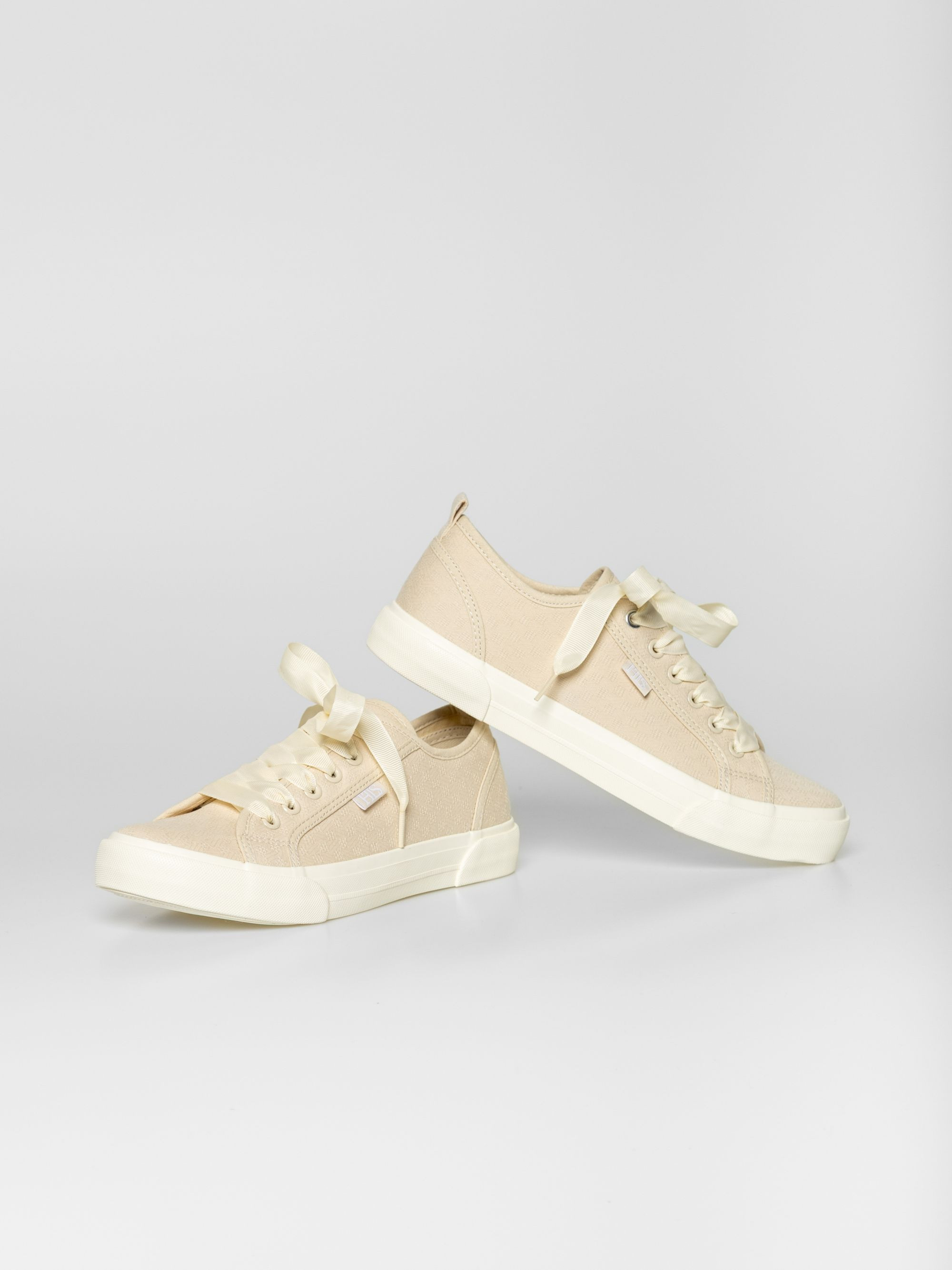 Heavy Tools anyagában mintás női vászoncipő, homok színben. Csúszásgátló gumi talppal, vastag szallag fűzővel, nyelvén és oldalán márkajelzéssel.