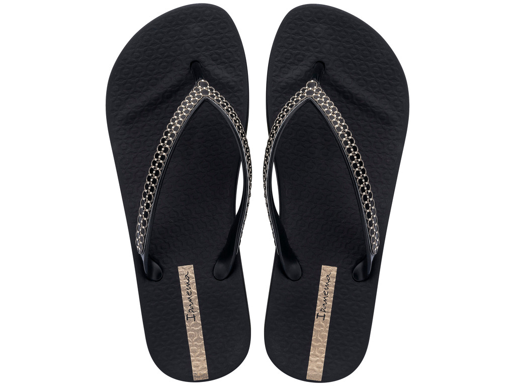 Ipanema női papucs, fekete színben, speciális, rugalmas és tartós műanyagból, vastagabb dombornyomott talppal, pántján fém hatású festett díszítéssel, talpán nyomott márkajelzéssel.