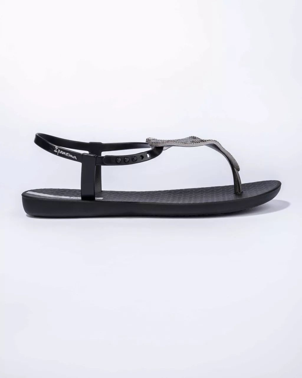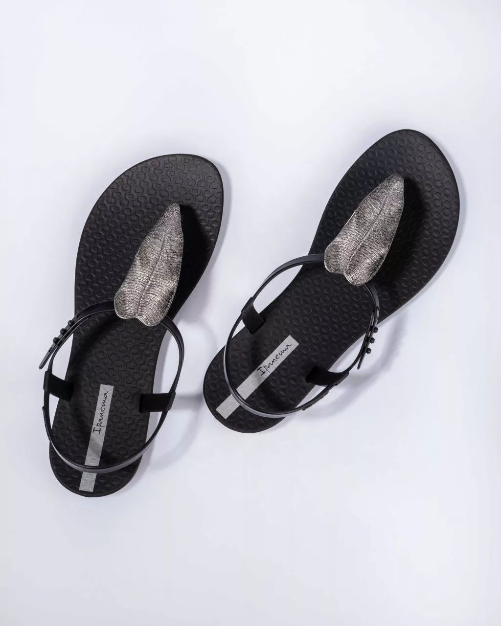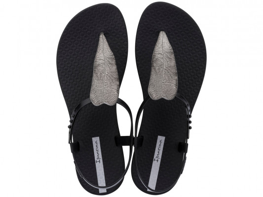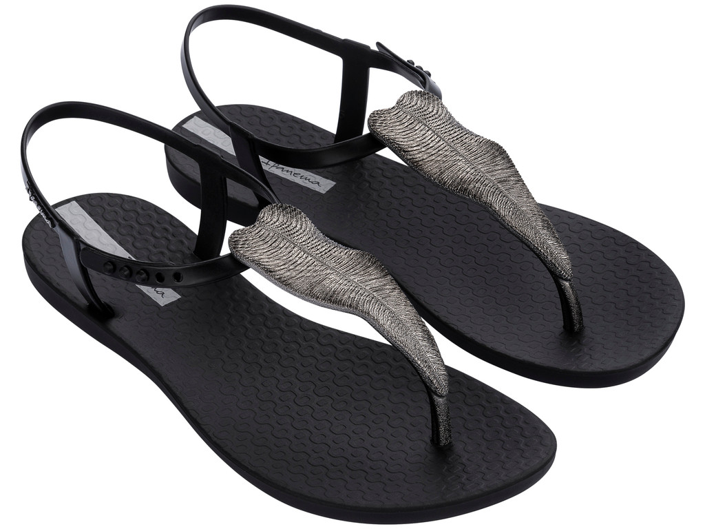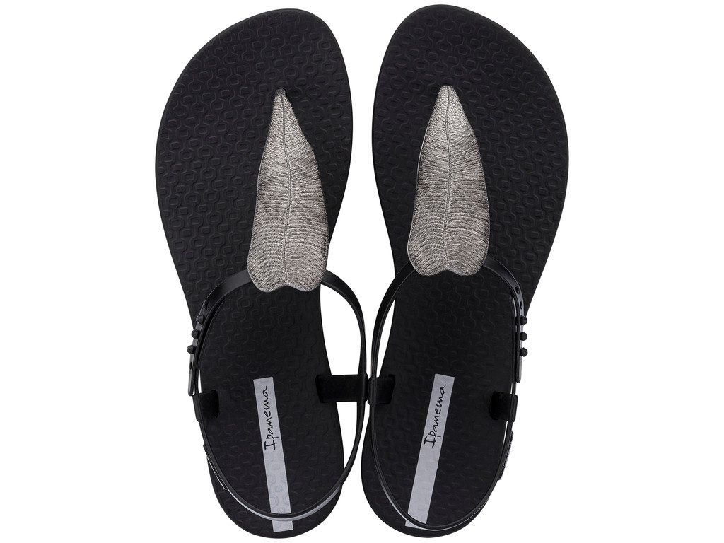 Ipanema női szandáls, fekete színben, speciális, rugalmas és tartós műanyagból, vékony dombornyomott talppal, pántján fém hatású leveles díszítéssel, pántján dombornyomott márkajelzéssel.