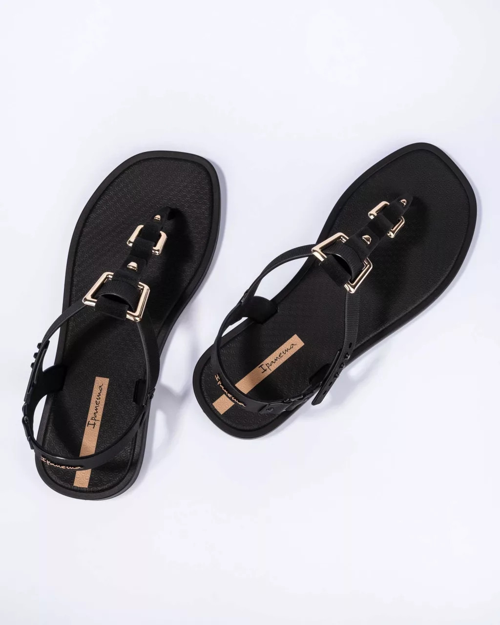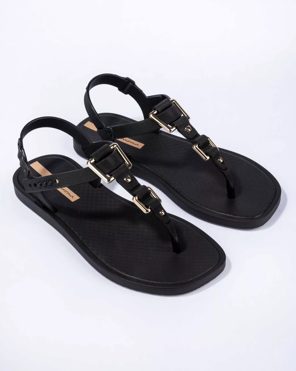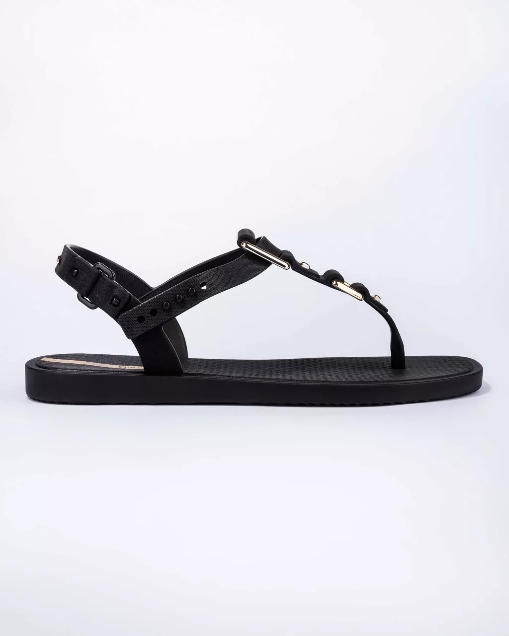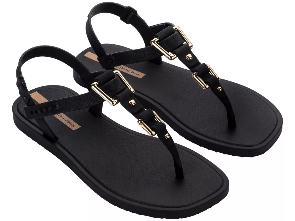 Ipanema könnyed kialakítású, tartós műanyag szandál fekete színben; kényelmes talpkialakítással; állítható pánttal; arany színű dekorációval; dombornyomott márkajelzéssel.