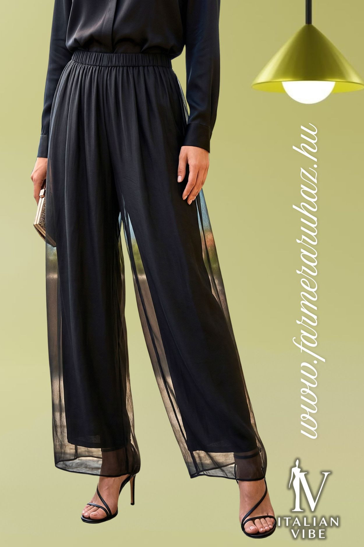 Italian Vibe női lenge nadrág, fekete színben, gumírozott derékrésszel, dupla anyaggal.