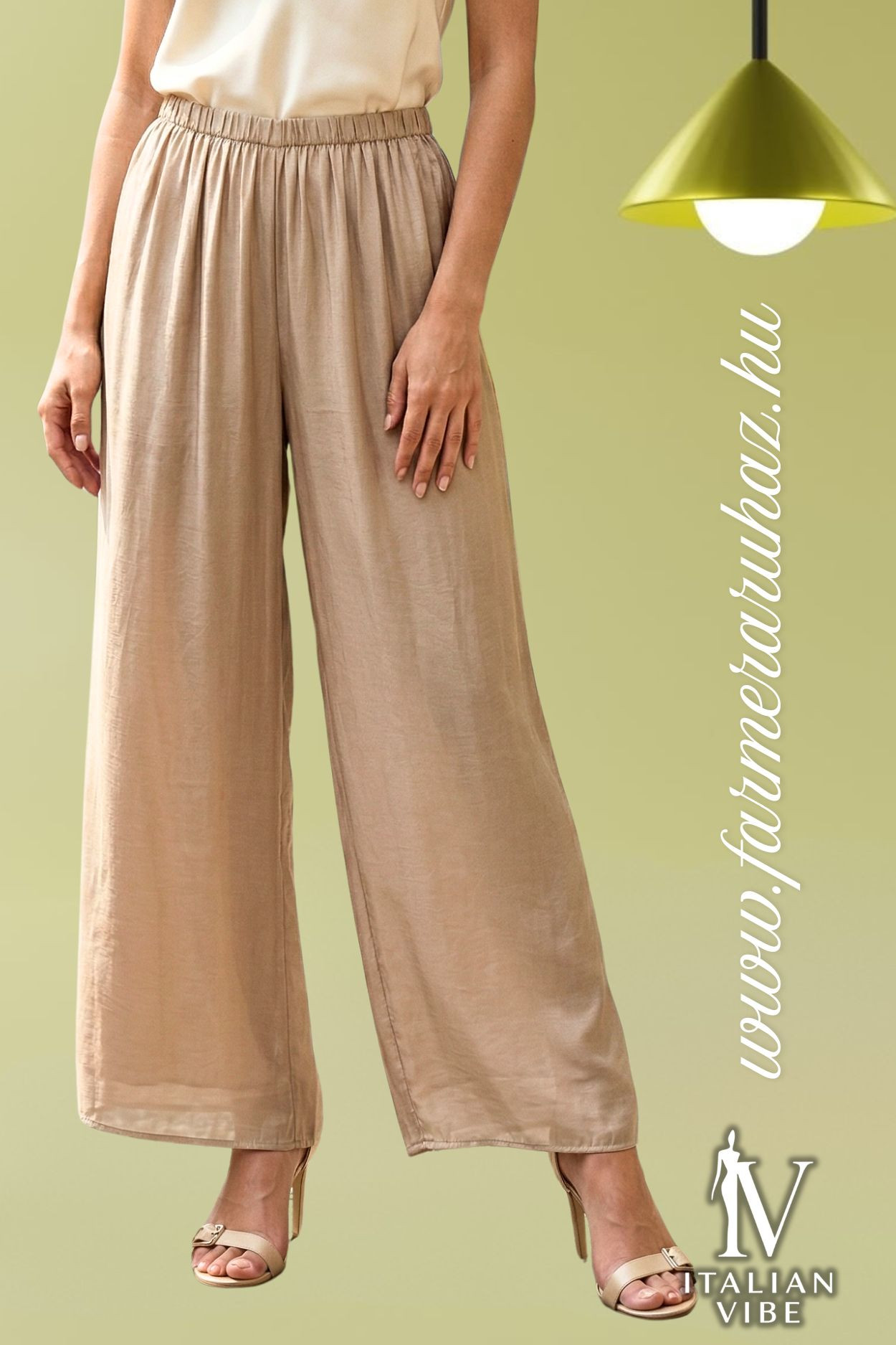 Italian Vibe női lenge nadrág, bézs színben, gumírozott derékrésszel, dupla anyaggal.