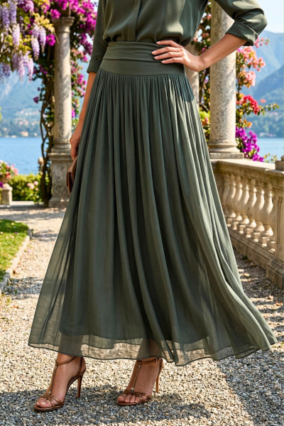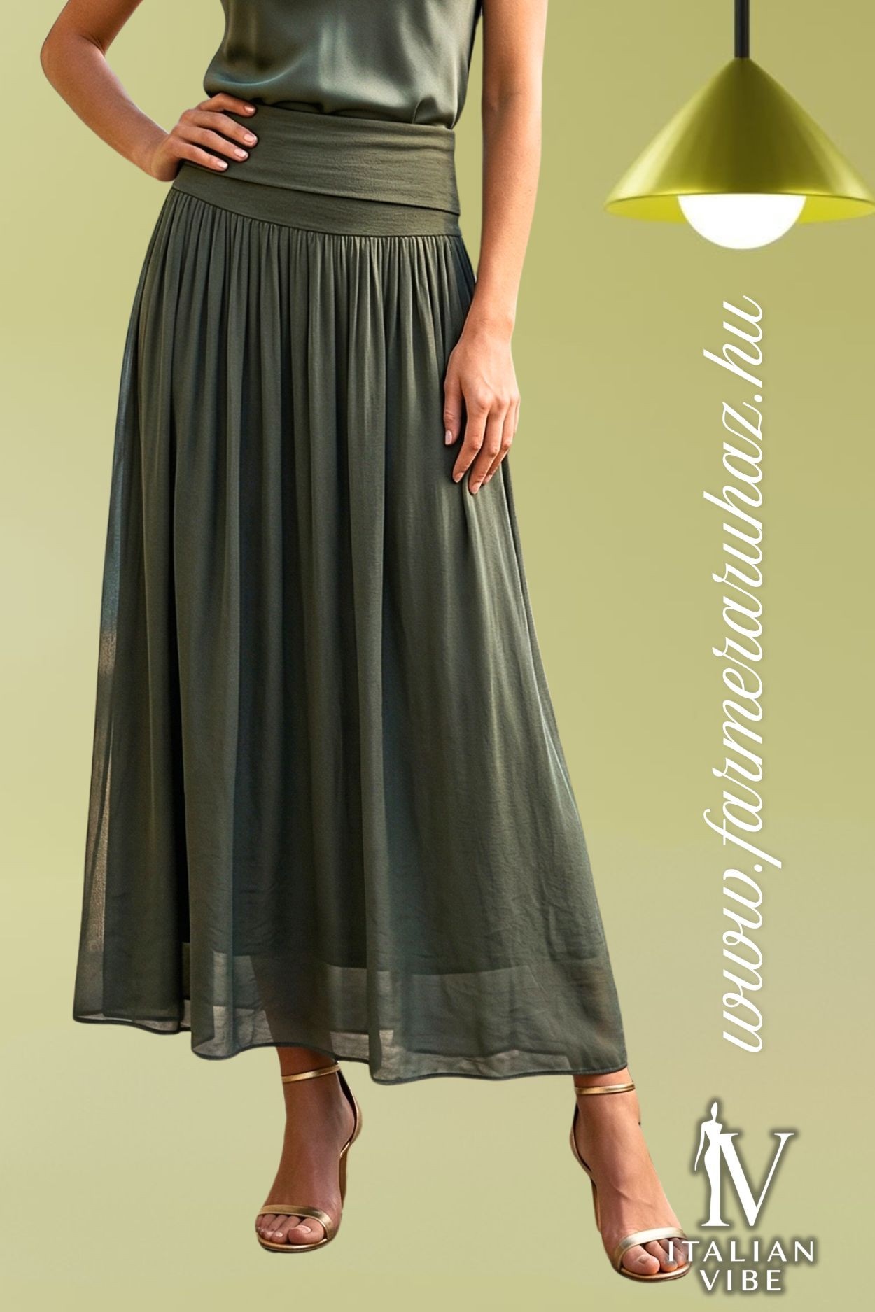 Italian Vibe női szoknya, khaki színben, lehajtott elasztikus derékrésszel, dupla anyaggal.
