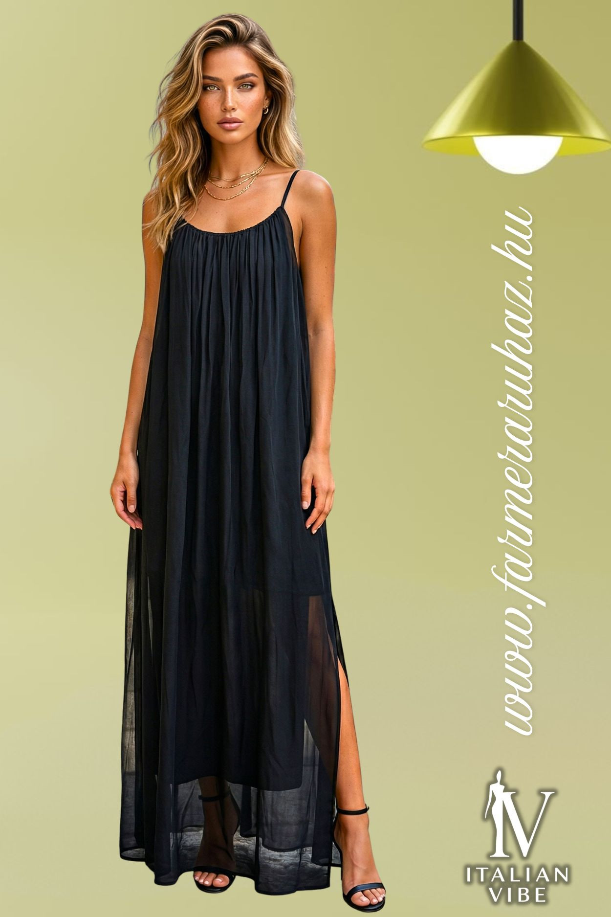 Italian Vibe női maxi ruha,fekete színben, laza, lenge fazonban, dupla anyagból, spagetti pántos kialakítással, alján enyhe slicceléssel.